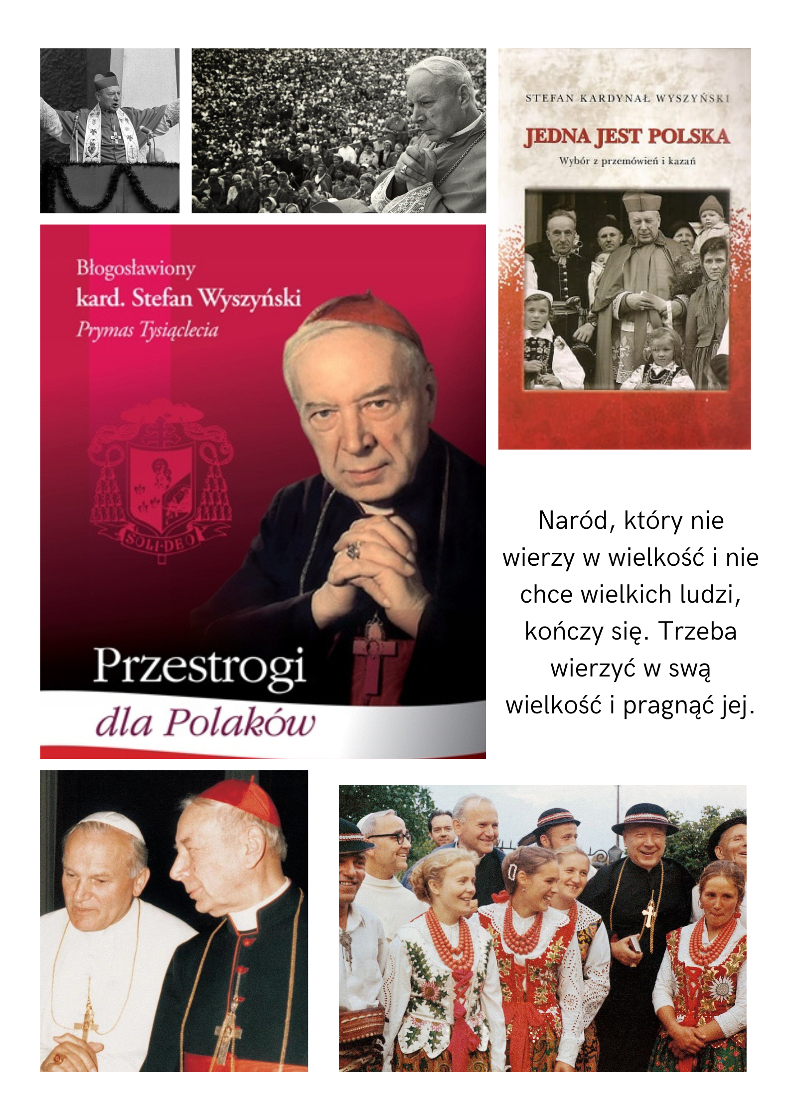 Wołam dziś do całego narodu, NIE DAJCIE się rozbić w wierze, Zachowajcie jedność w wierze My wiemy że są programy społeczne a nawet polityczne, które zapowiadają Polskę inną niż Chrystusową: wiarę w niewiarę Głoszą pochwałę niewiary I przygotowują program wychowania w niewierze My wam głosimy wiarę w Boga Ojca Wszechmocnego w Zbawcę i Brata naszego Jezusa Chrystusa raz Świętego Ducha, który jest potrzebny Polsce.