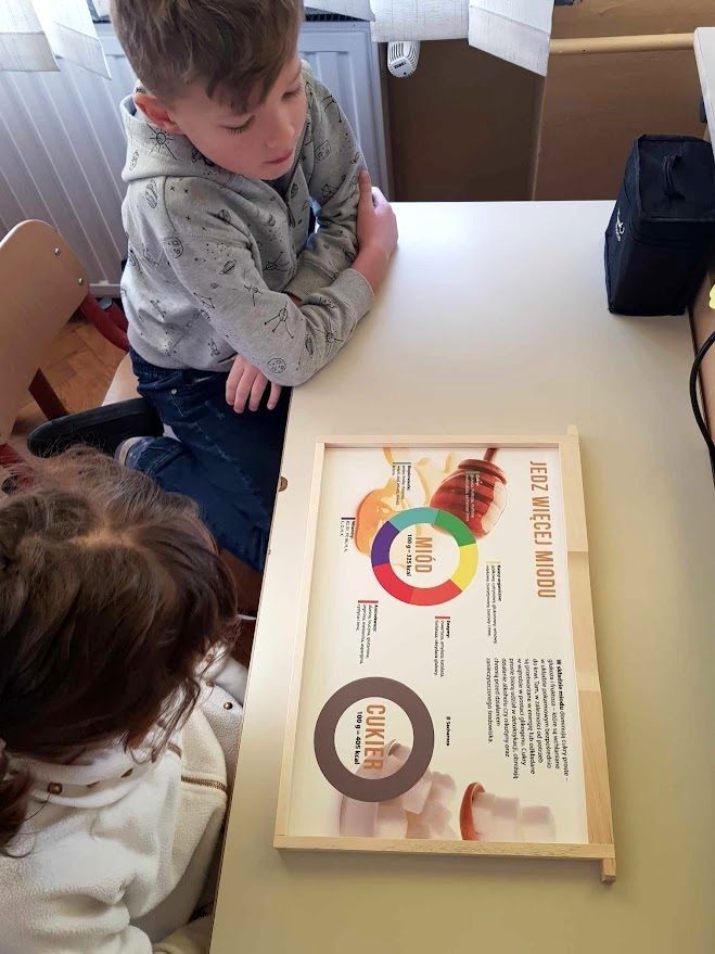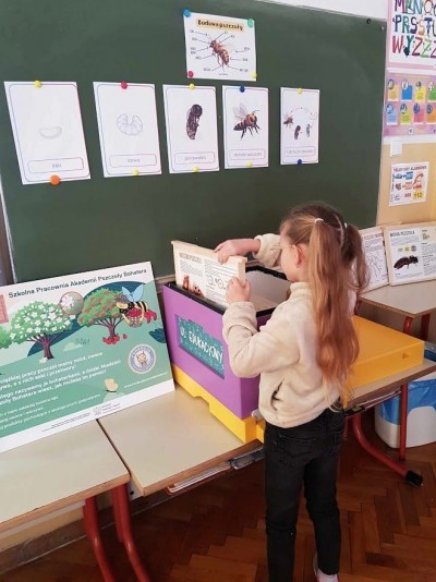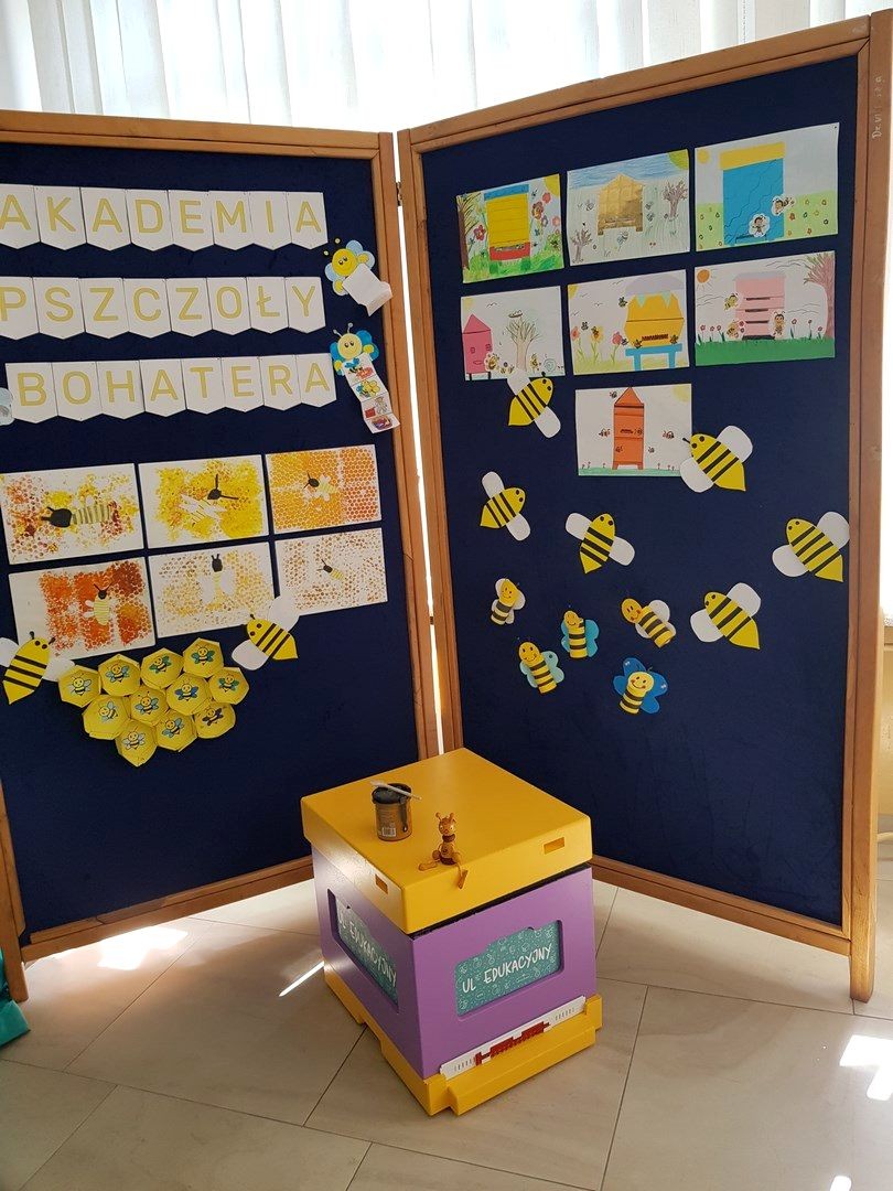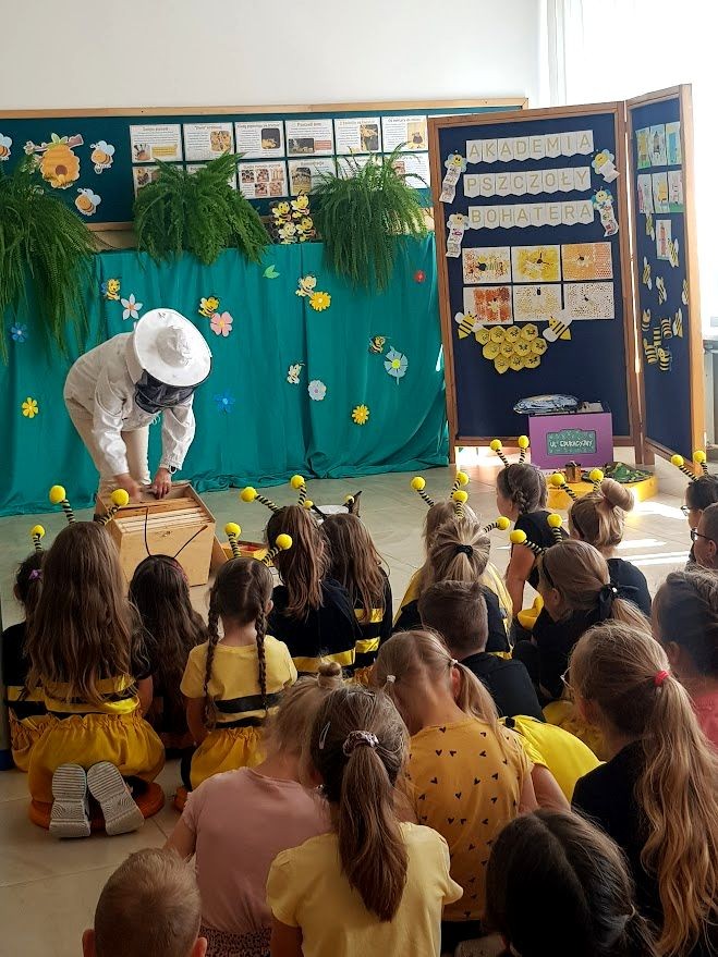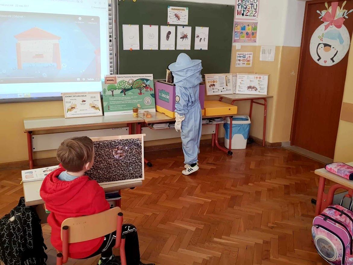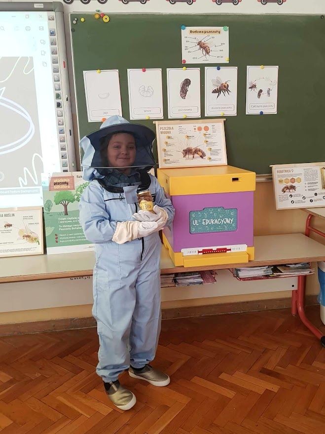 Szkolna Pracownia Akademii Pszczoły Bohatera wyposażona w materiały dydaktyczne: ul edukacyjny, kombinezon, rękawice pszczelarskie, które wykorzystywane były podczas cyklicznych zajęć z uczniami. Dzieci aktywnie w nich uczestniczyły, z zaciekawieniem oglądały filmy dotyczące życia pszczół, z zainteresowaniem przeglądały akcesoria pszczelarskie, a nawet skorzystały z okazji do przymierzenia stroju pszczelarza. Ponadto otrzymały do skosztowania naturalny i zdrowy sok oraz chipsy jabłkowe.