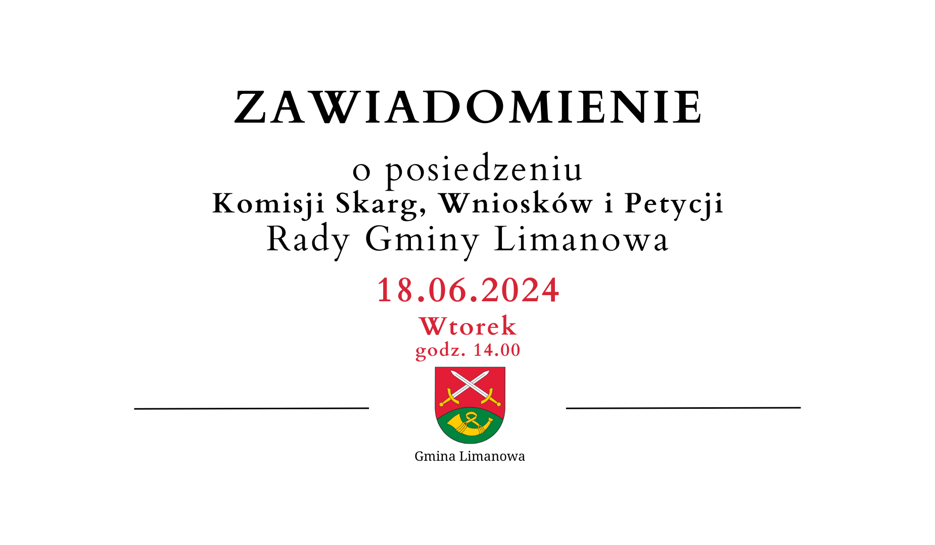 Na podstawie § 60 ust. 3 uchwały Nr XXIX/278/2018 Rady Gminy Limanowa z dnia 6 września 2018 r. w sprawie Statutu Gminy Limanowa (Dz. Urz. Woj. Mał. z 2018 r. poz. 6395) zapraszam na posiedzenie Komisji Skarg, Wniosków i Petycji Rady Gminy Limanowa, które odbędzie się w dniu 18 czerwca 2024 r. /wtorek/ o godz. 14.00 w pokoju nr 2A (I piętro) Urzędu Gminy Limanowa.