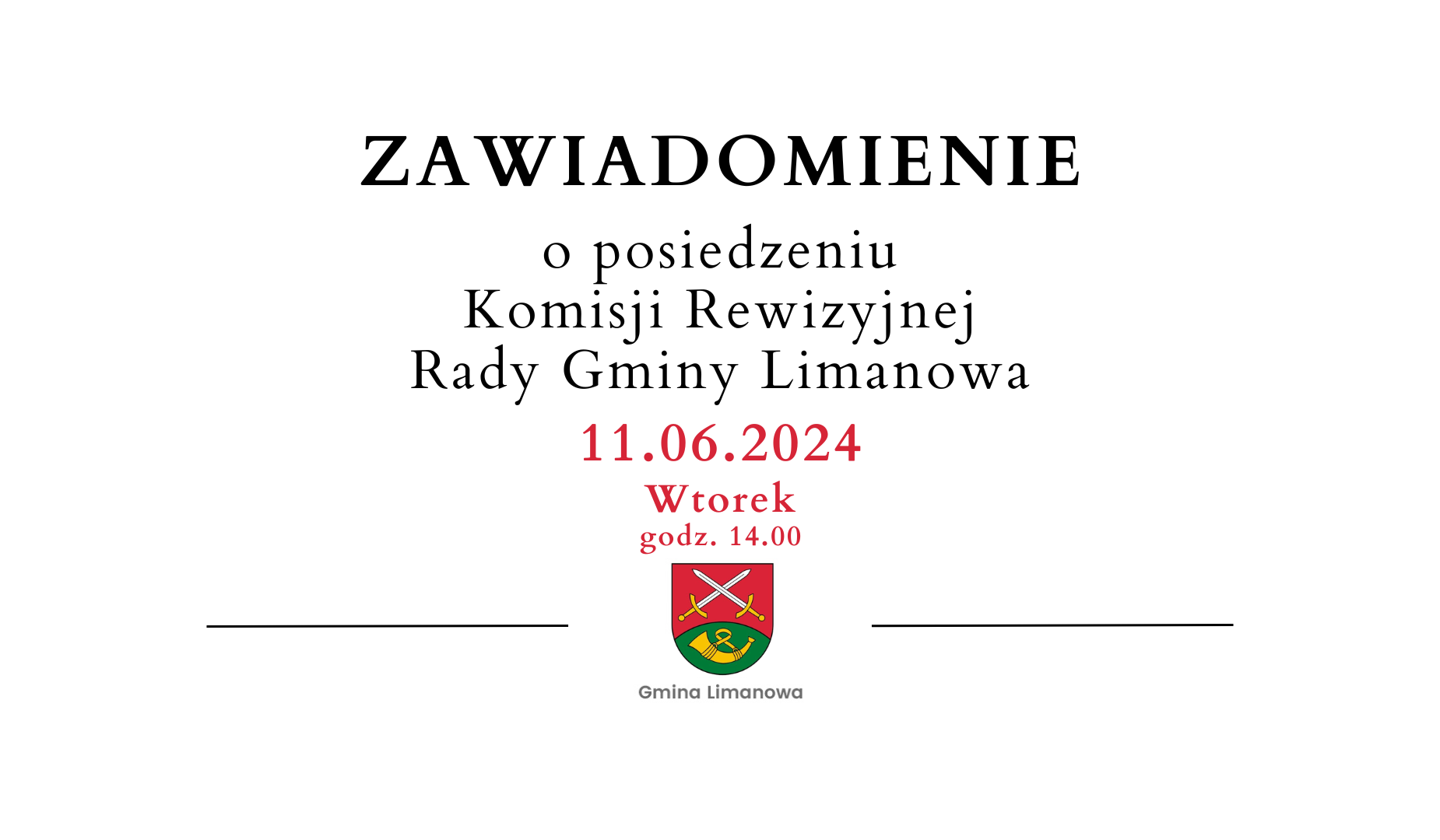Na podstawie § 60 ust. 3 uchwały Nr XXIX/278/2018 Rady Gminy Limanowa z dnia 6 września 2018 r. w sprawie Statutu Gminy Limanowa (Dz. Urz. Woj. Mał. z 2018 r. poz. 6395) zapraszam na posiedzenie Komisji Rewizyjnej Rady Gminy Limanowa, które odbędzie się w dniu 11 czerwca 2024 r. /wtorek/ o godz. 14:00 w sali konferencyjnej Urzędu Gminy Limanowa.