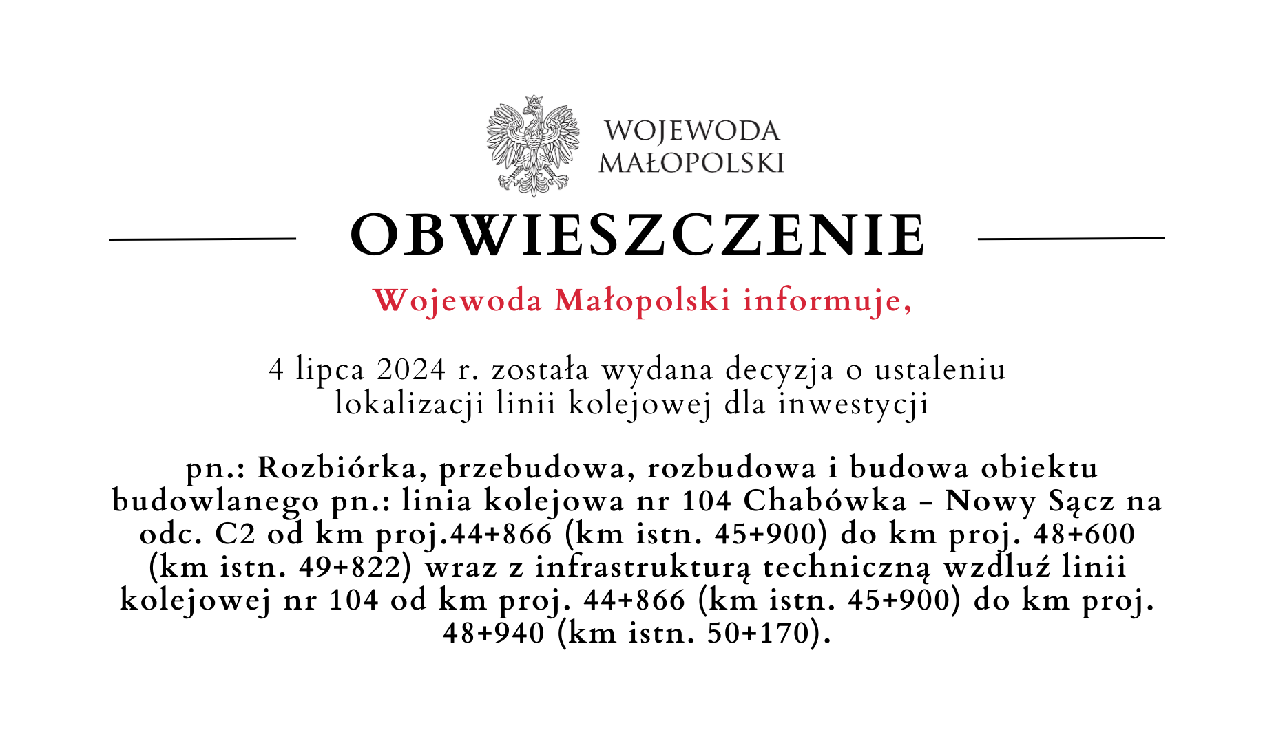 zawiadamia, że 4 lipca 2024 r. została wydana decyzja o ustaleniu lokalizacji linii kolejowej dla inwestycji pn.: Rozbiórka, przebudowa, rozbudowa i budowa obiektu budowlanego pn.: linia kolejowa nr 104 Chabówka - Nowy Sącz na odc. C2 od km proj. 44+866 (km istn. 45+900) do km proj. 48+600 (km istn. 49+822) wraz z infrastrukturą techniczną wzdłuż linii kolejowej nr 104 od km proj. 44+866 (km istn. 45+900) do km proj. 48+940 (km istn. 50+170), na wniosek złożony w Małopolskim Urzędzie Wojewódzkim w Krakowie przez inwestora PKP Polskie Linie Kolejowe S.A. (ul. Targowa 74, 03-734 Warszawa), działającego przez pełnomocnika.