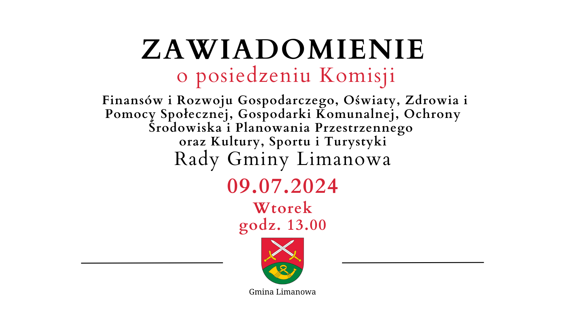 Na podstawie § 60 ust. 1, ust. 3 i ust. 7 uchwały Nr XXIX/278/2018 Rady Gminy Limanowa z dnia 6 września 2018 r. w sprawie Statutu Gminy Limanowa (Dz. Urz. Woj. Mał. z 2018 r. poz. 6395) zapraszam na wspólne posiedzenie Komisji Finansów i Rozwoju Gospodarczego, Komisji Oświaty, Zdrowia i Pomocy Społecznej, Komisji Gospodarki Komunalnej, Ochrony Środowiska i Planowania Przestrzennego oraz Komisji Kultury, Sportu i Turystyki Rady Gminy Limanowa, które odbędzie się w dniu 9 lipca 2024 r. /wtorek/ o godz. 13.00 w sali konferencyjnej Urzędu Gminy Limanowa.