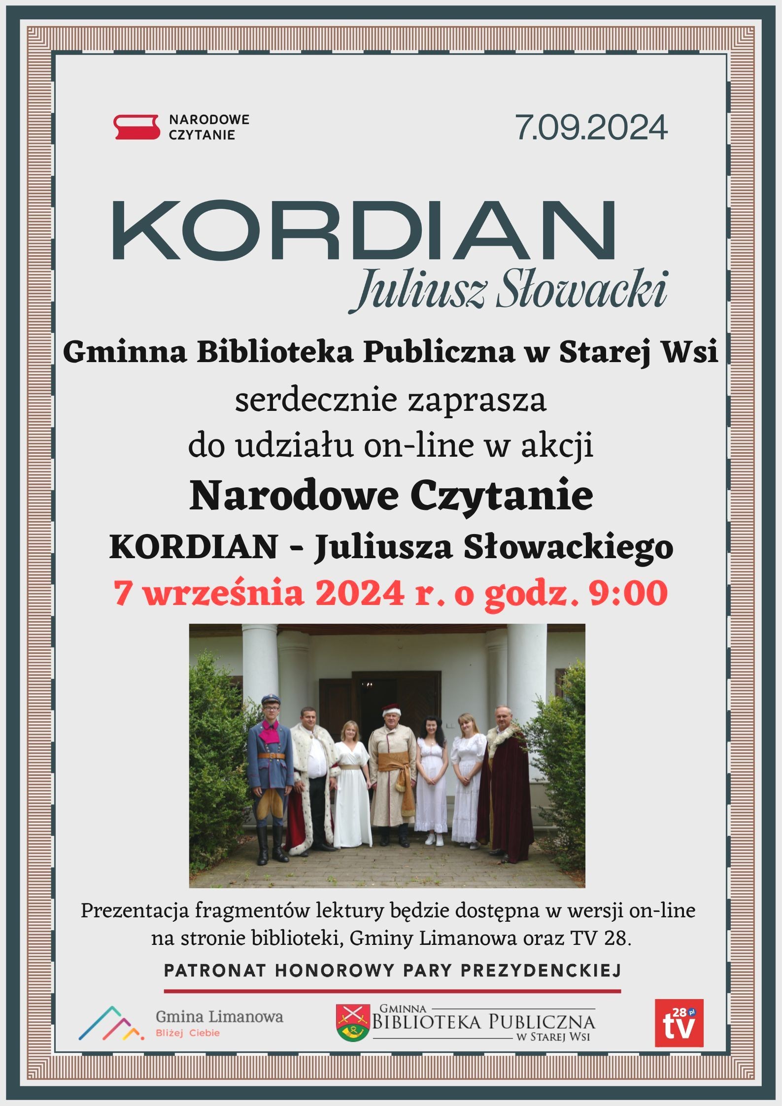Gorąco zachęcamy również do wspólnego oglądania pełnego nagrania "Kordiana" 7 września. Będzie to niepowtarzalna okazja, aby wspólnie zanurzyć się w świat dramatycznych wydarzeń i głębokich refleksji, jakie niesie ze sobą dzieło Juliusza Słowackiego.