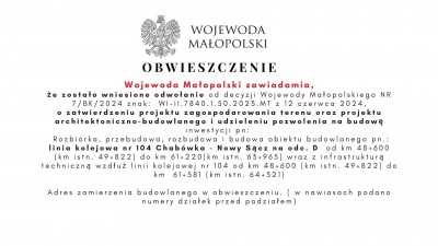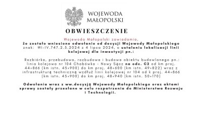 że zostało wniesione odwołanie od decyzji Wojewody Małopolskiego znak: WI-IV.747.2.5.2024 z 4 lipca 2024,