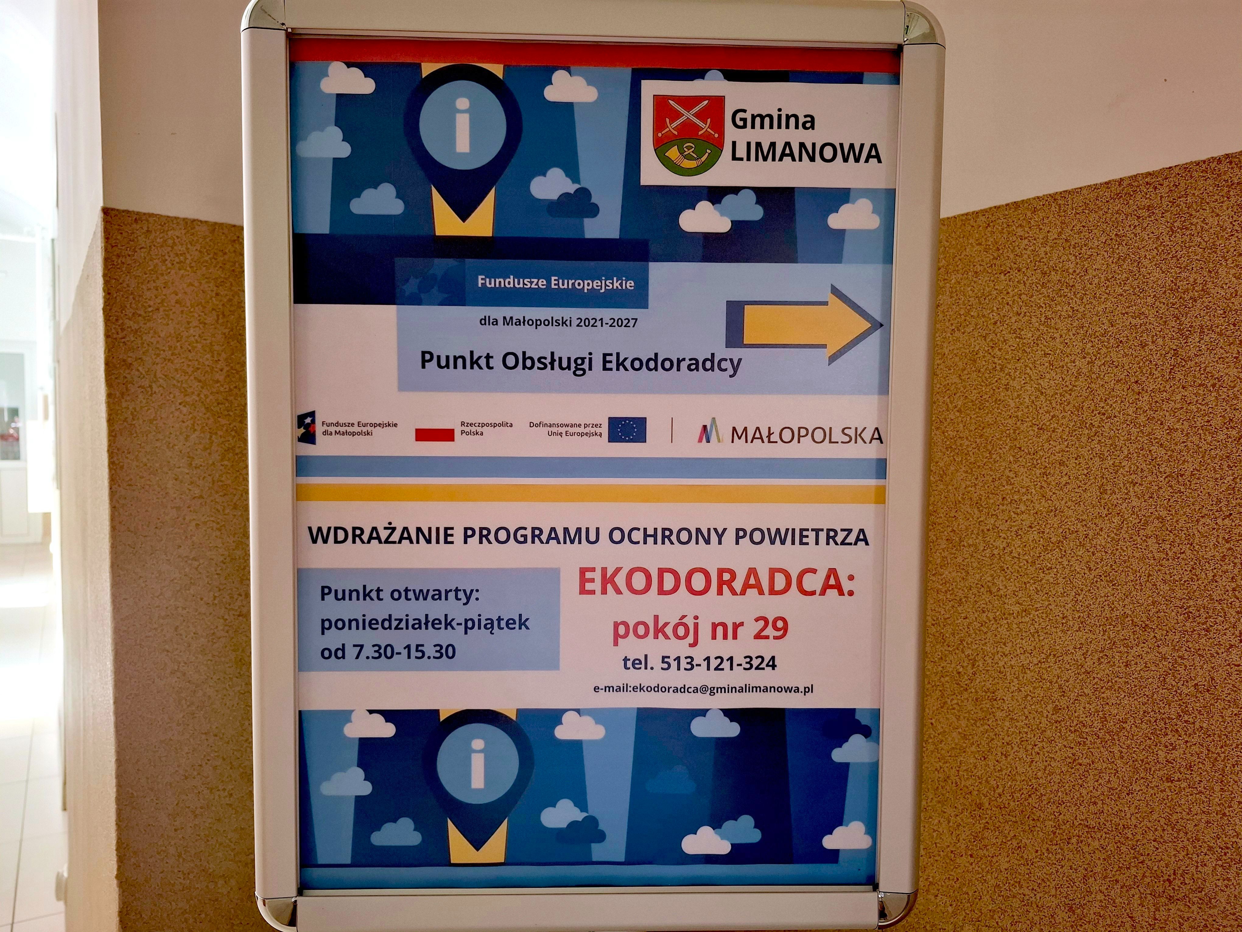 Informujemy, iż od 1 sierpnia 2024r. w Urzędzie Gminy Limanowa na parterze w pok. 29 od poniedziałku do piątku w godzinach od 7:30 do 15:30 czynny jest Punkt Obsługi Ekodoradcy.