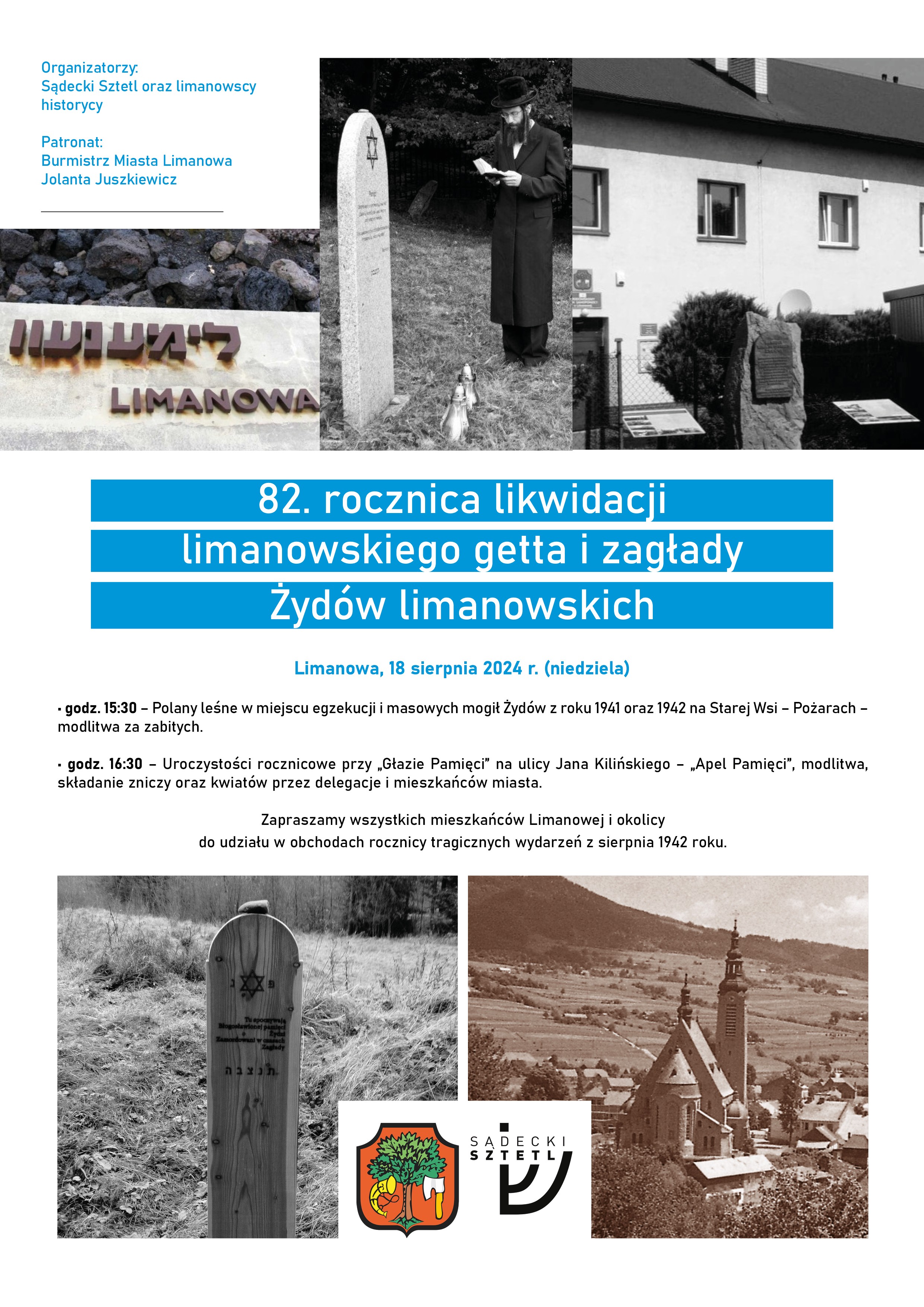 W najbliższą niedzielę 18 sierpnia 2024 r. odbędą się w Limanowej obchody 82 rocznicy. likwidacji getta i zagłady Żydów limanowskich. Główne uroczystości rocznicowe odbędą się o godzinie 1630 przy „Głazie Pamięci” na ulicy Jana Kilińskiego, gdzie zgromadzeni będą uczestniczyć w modlitwie i „Apelu Pamięci” oraz złożą kwiaty i znicze. Uroczystość na ulicy Kilińskiego poprzedzi spotkanie w miejscu egzekucji części Żydów na polanach leśnych w Starej Wsi – Pożarach o godzinie 1530.