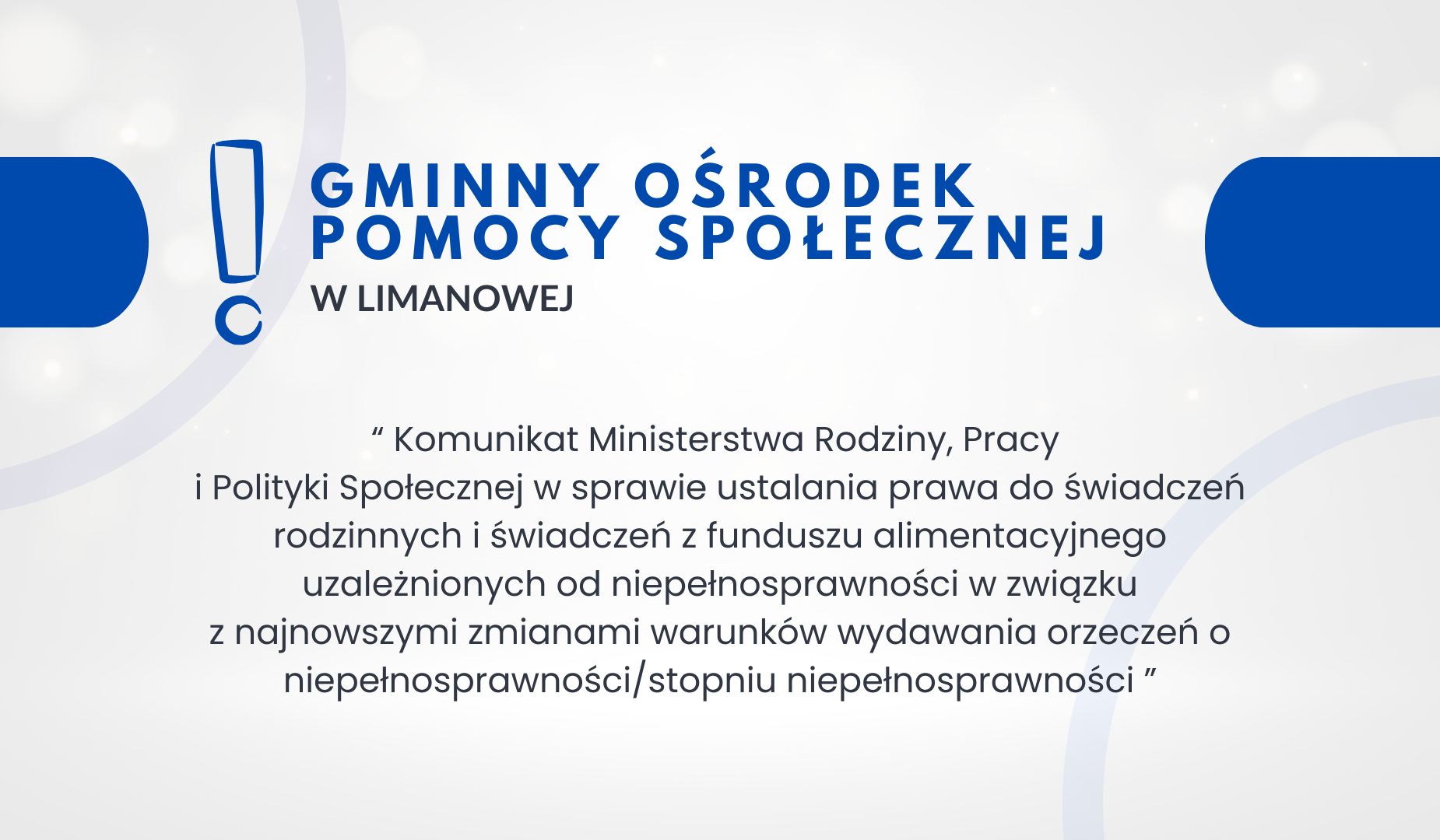 Gminny Ośrodek Pomocy Społecznej w Limanowej informuje, że na stronie Ministerstwa Rodziny, Pracy i Polityki Społecznej został zamieszczony komunikat dot. ustalania prawa do świadczeń rodzinnych i świadczeń z funduszu alimentacyjnego uzależnionych od niepełnosprawności w związku z najnowszymi zmianami warunków wydawania orzeczeń o niepełnosprawności/stopniu niepełnosprawności.