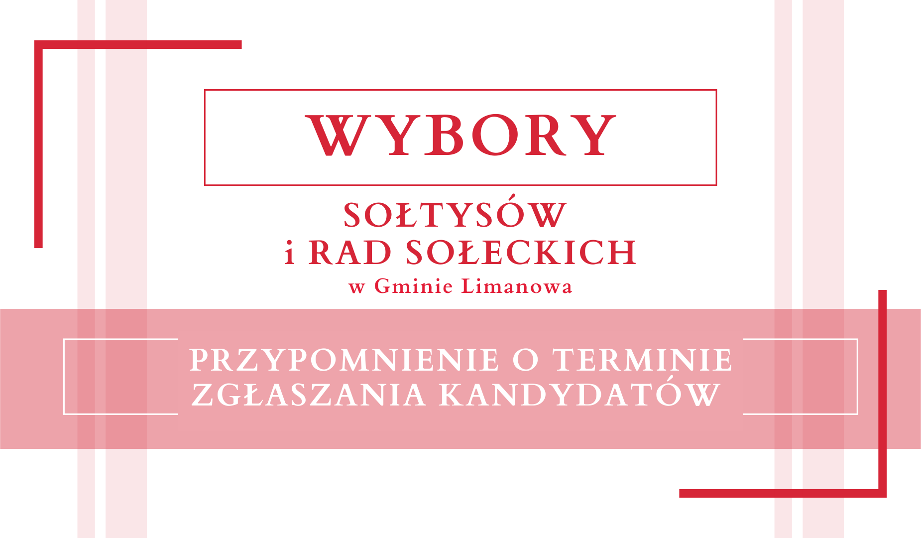 Przypominamy, że zgodnie z obowiązującym kalendarzem wyborczym, termin zgłaszania kandydatów na sołtysów oraz członków rad sołeckich upływa w czwartek, 5 września br. Wszystkie osoby zainteresowane udziałem w nadchodzących wyborach, zarówno w roli kandydata na stanowisko sołtysa, jak i członka rady sołeckiej, powinny zgłosić swoje kandydatury przed upływem wyznaczonego terminu.