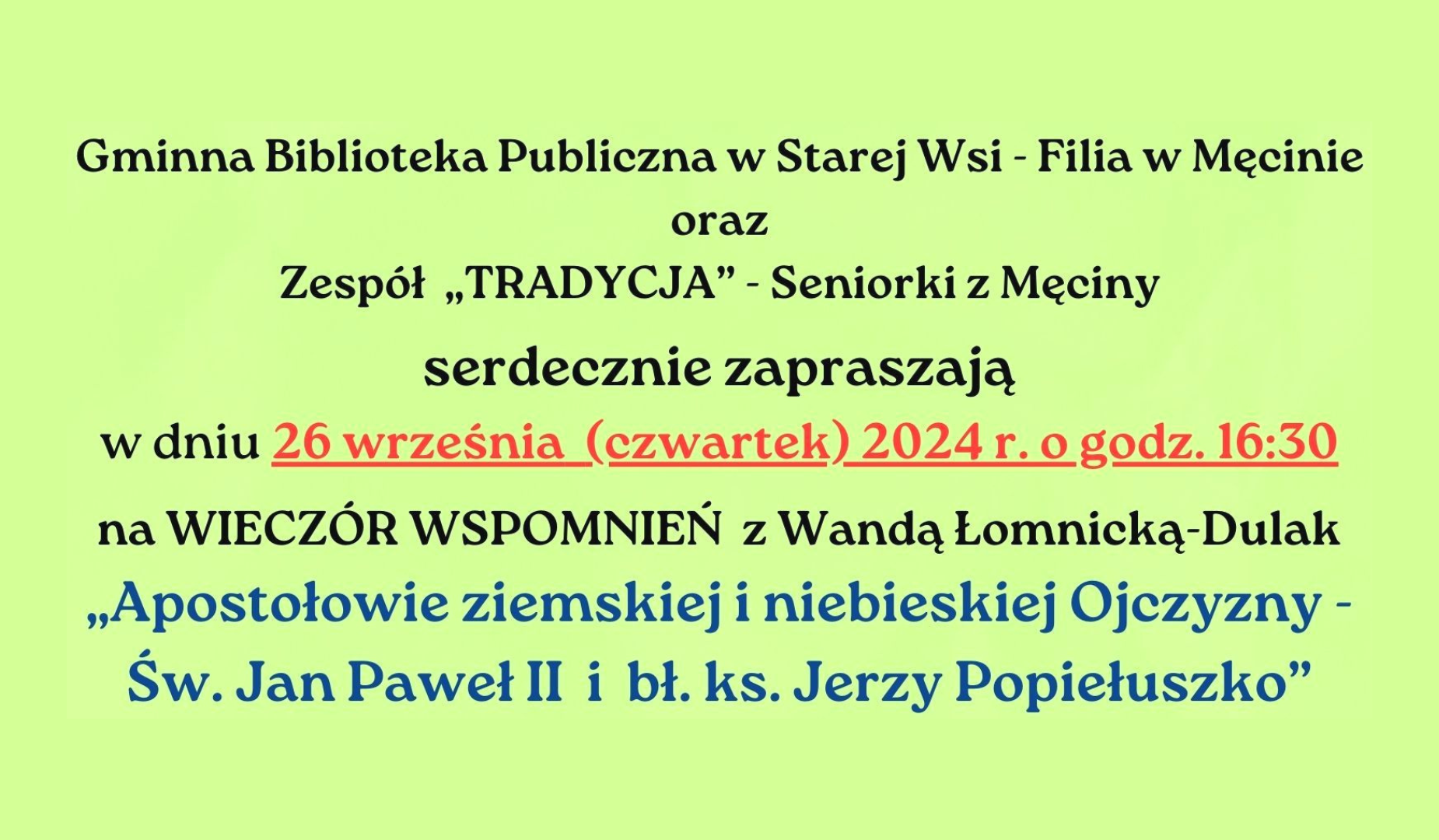 Gminna Biblioteka w Starej Wsi serdecznie zaprasza w dniu 26 września 2024 r. (czwartek) o godz. 16:30 do Biblioteki Publicznej w Męcinie na WIECZÓR WSPOMNIEŃ z Wandą Łomnicką-Dulak pt.: "Apostołowie ziemskiej i niebieskiej Ojczyzny - Św. Jan Paweł II i bł. ks. Jerzy Popiełuszko.