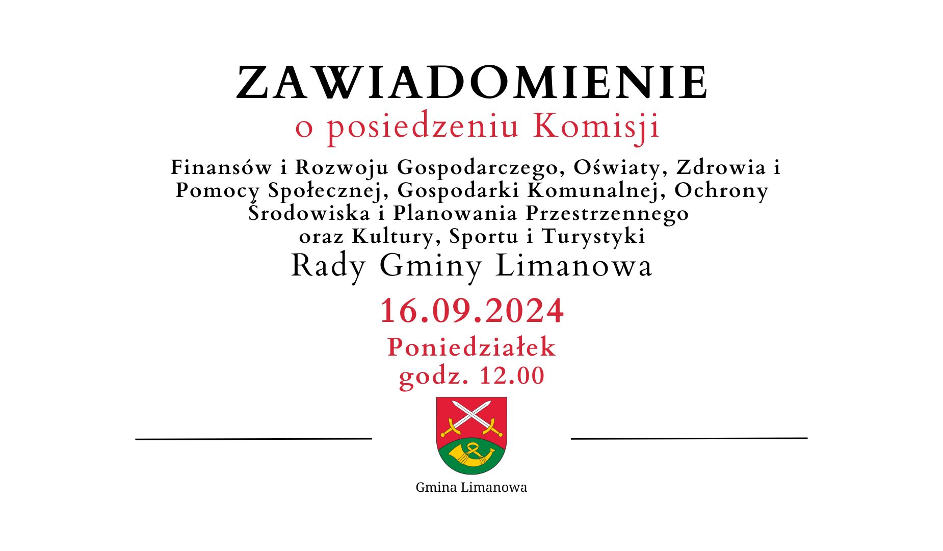 Na podstawie § 60 ust. 1, ust. 3 i ust. 7 uchwały Nr XXIX/278/2018 Rady Gminy Limanowa z dnia 6 września 2018 r. w sprawie Statutu Gminy Limanowa (Dz. Urz. Woj. Mał. z 2018 r. poz. 6395) zapraszam na wspólne posiedzenie Komisji Finansów i Rozwoju Gospodarczego, Komisji Oświaty, Zdrowia i Pomocy Społecznej, Komisji Gospodarki Komunalnej, Ochrony Środowiska i Planowania Przestrzennego oraz Komisji Kultury, Sportu i Turystyki Rady Gminy Limanowa, które odbędzie się w dniu 16 września 2024 r. /poniedziałek/ o godz. 12.00 w sali konferencyjnej Urzędu Gminy Limanowa.