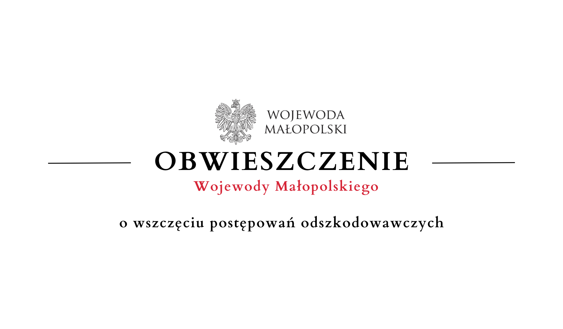 Wojewoda Małopolski uprzejmie informuje, że stosownie do art. 61 § 1 ustawy z dnia 14 czerwca 1960 r. Kodeks postępowania administracyjnego (tekst jednolity: Dz. U. z 2024 r., poz. 572) zwanej dalej „kpa”, w związku z art. 9q ust. 1 pkt 8, art. 9s ust. 9, 10, 10a i 11 ustawy z dnia 28 marca 2003 r. o transporcie kolejowym (tekst jednolity Dz. U. z 2024 r., poz. 697), zostały wszczęte z urzędu postępowania w przedmiocie ustalenia wysokości odszkodowania z tytułu ograniczenia w sposobie korzystania z części nieruchomości objętych decyzją Wojewody Małopolskiego z dnia 2 czerwca 2023 r. znak: WI-IV.747.2.1.2023, o ustaleniu lokalizacji linii kolejowej dla inwestycji pn.: „Rozbiórka, przebudowa, rozbudowa i budowa obiektu budowlanego pn.: linia kolejowa nr 104 Chabówka - Nowy Sącz na odc. D od km 48+600 (km istn. 49+822) do km 61+220 (km istn. 63+965) wraz z infrastrukturą techniczną wzdłuż linii kolejowej nr 104 na odcinku od km 48+600 (km istn. 49+822) do km 61+581 (km istn. 64+321), realizowanej w ramach projektu: Budowa nowej linii kolejowej Podłęże – Szczyrzyc – Tymbark / Mszana Dolna oraz modernizacja istniejącej linii kolejowej nr 104 Chabówka – Nowy Sącz – Etap I: prace przygotowawcze”, zwaną dalej „decyzją” – wykaz działek objętych decyzją wobec których zostały wszczęte postępowania odszkodowawcze, stanowi załącznik do niniejszego obwieszczenia.