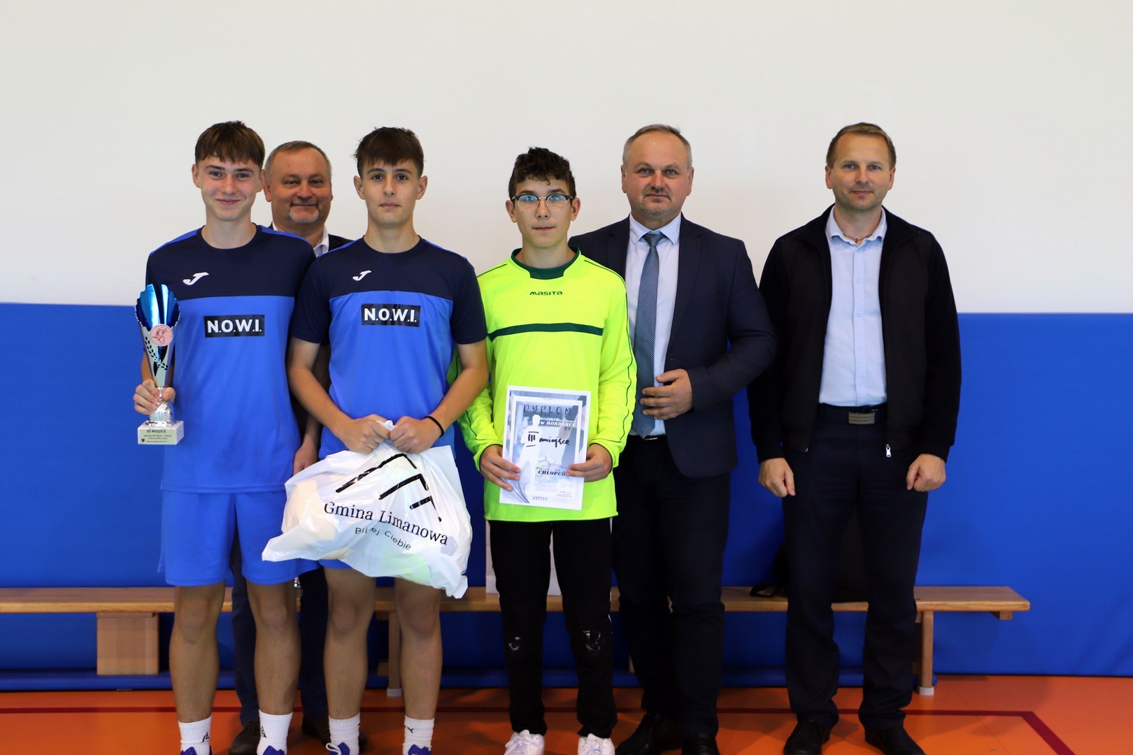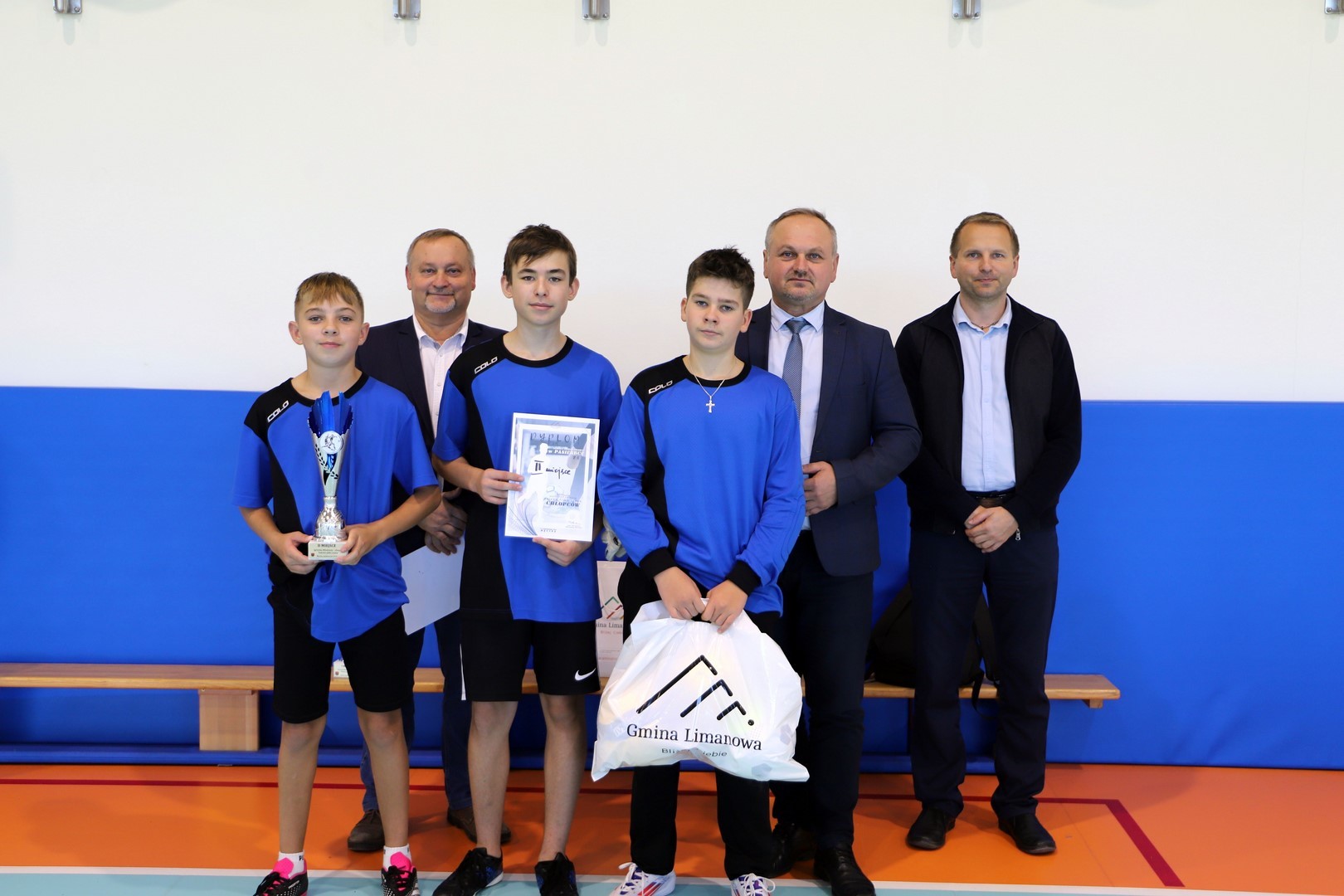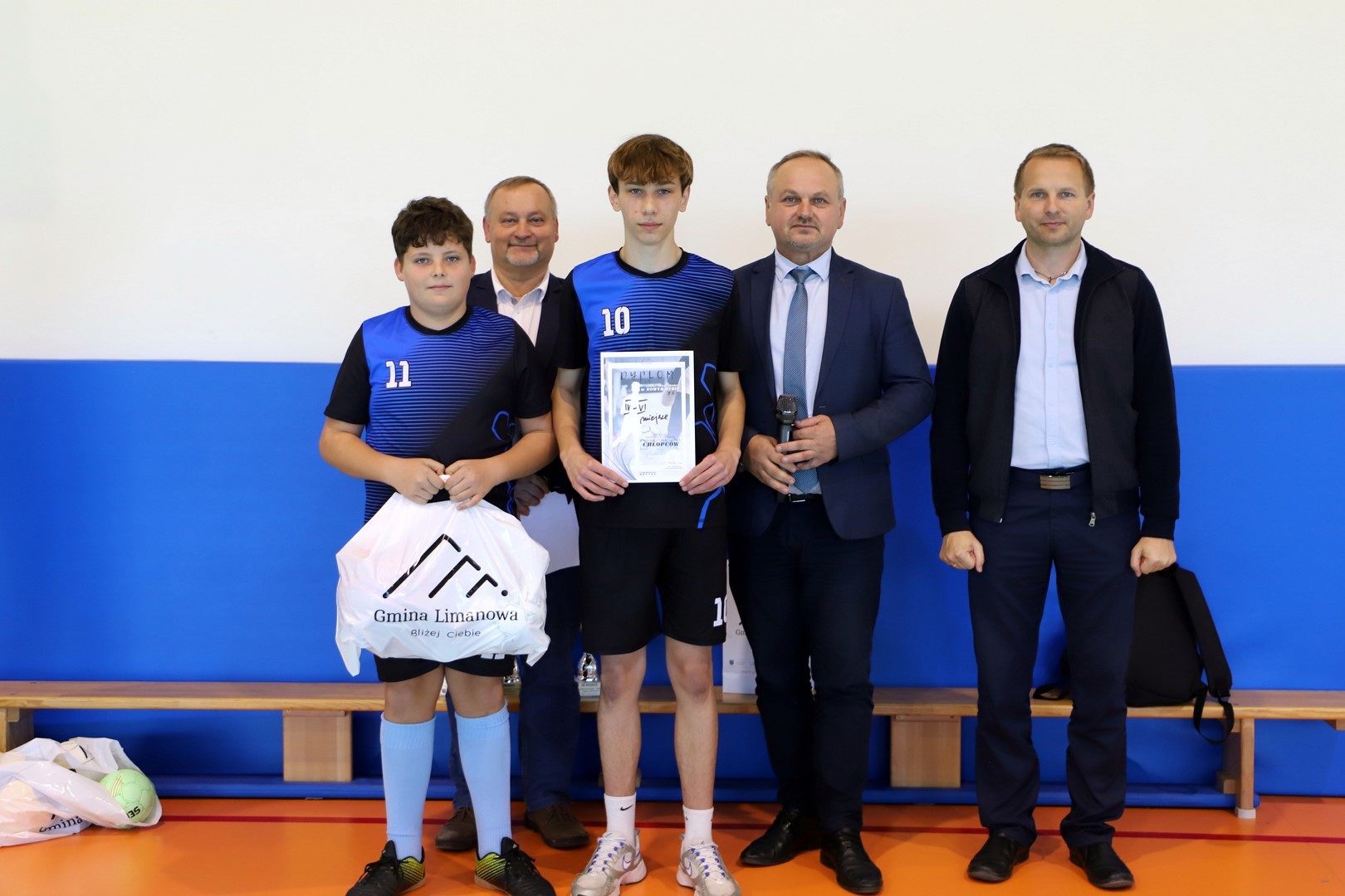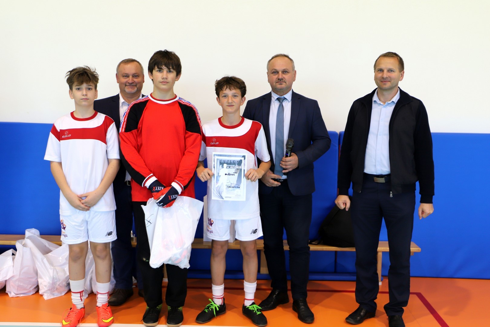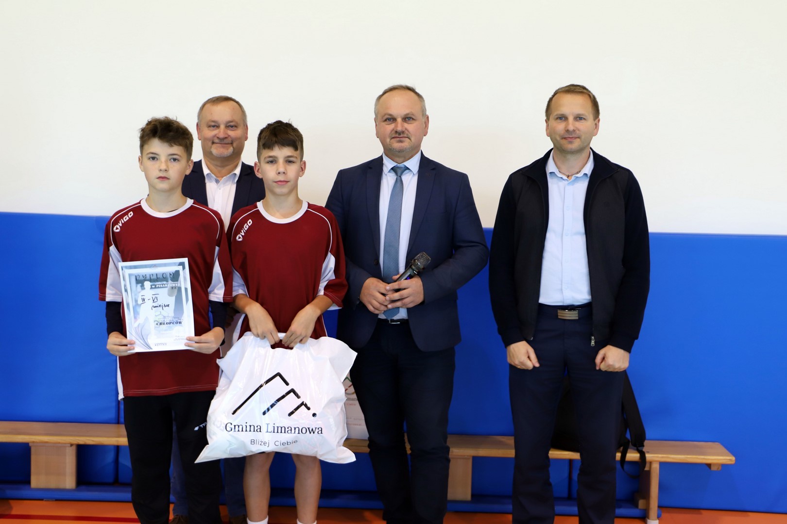 Wręczenia dyplomów oraz nagród uczestnikom rozgrywek piłkarskich dokonali, Jan Skrzekut Wójt Gminy Limanowa, Wojciech Pazdan zastępca Wójta Gminy Limanowa i dyrektor Szkoły Podstawowej nr 1 w Męcinie Grzegorz Krzak.