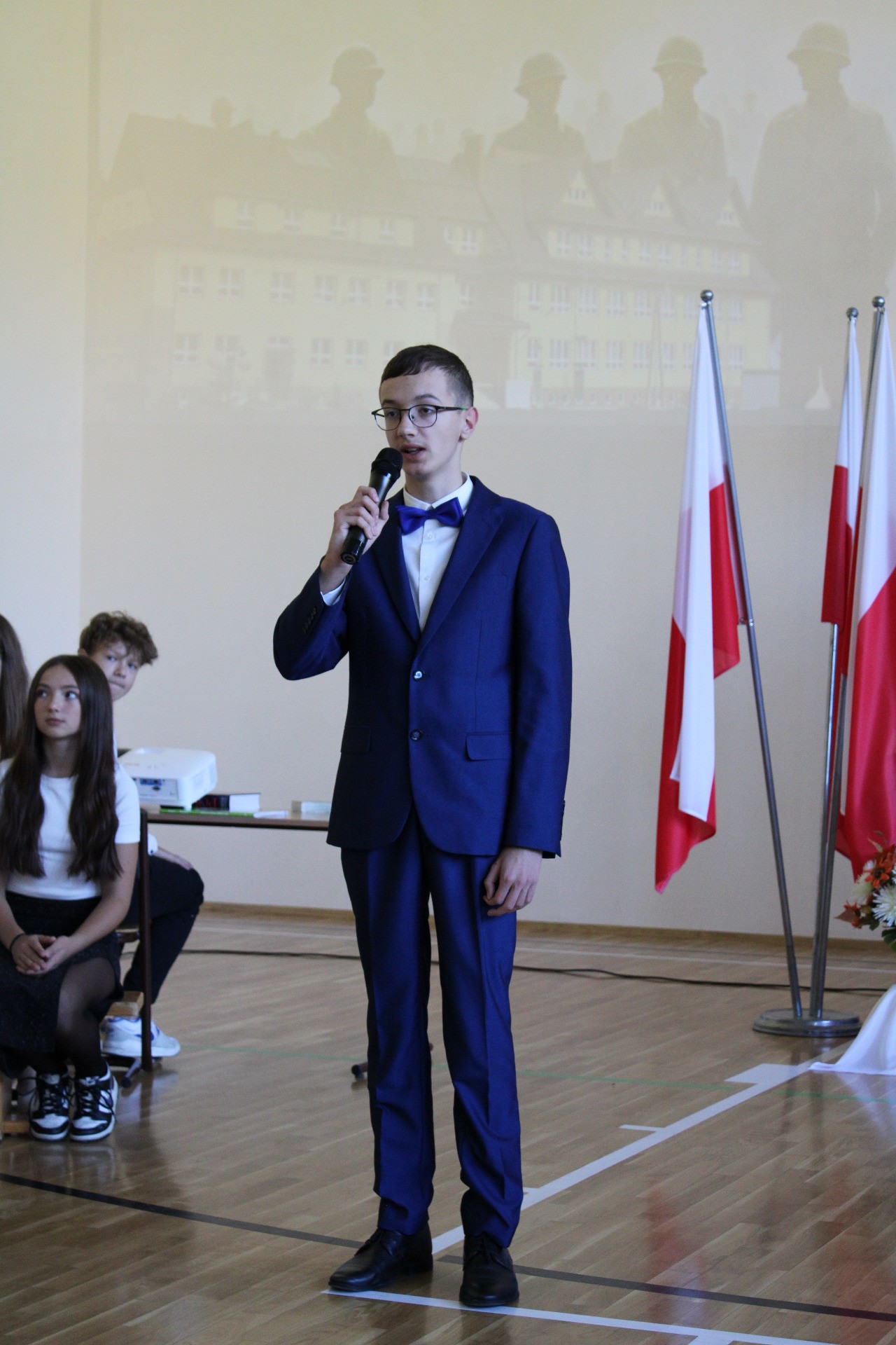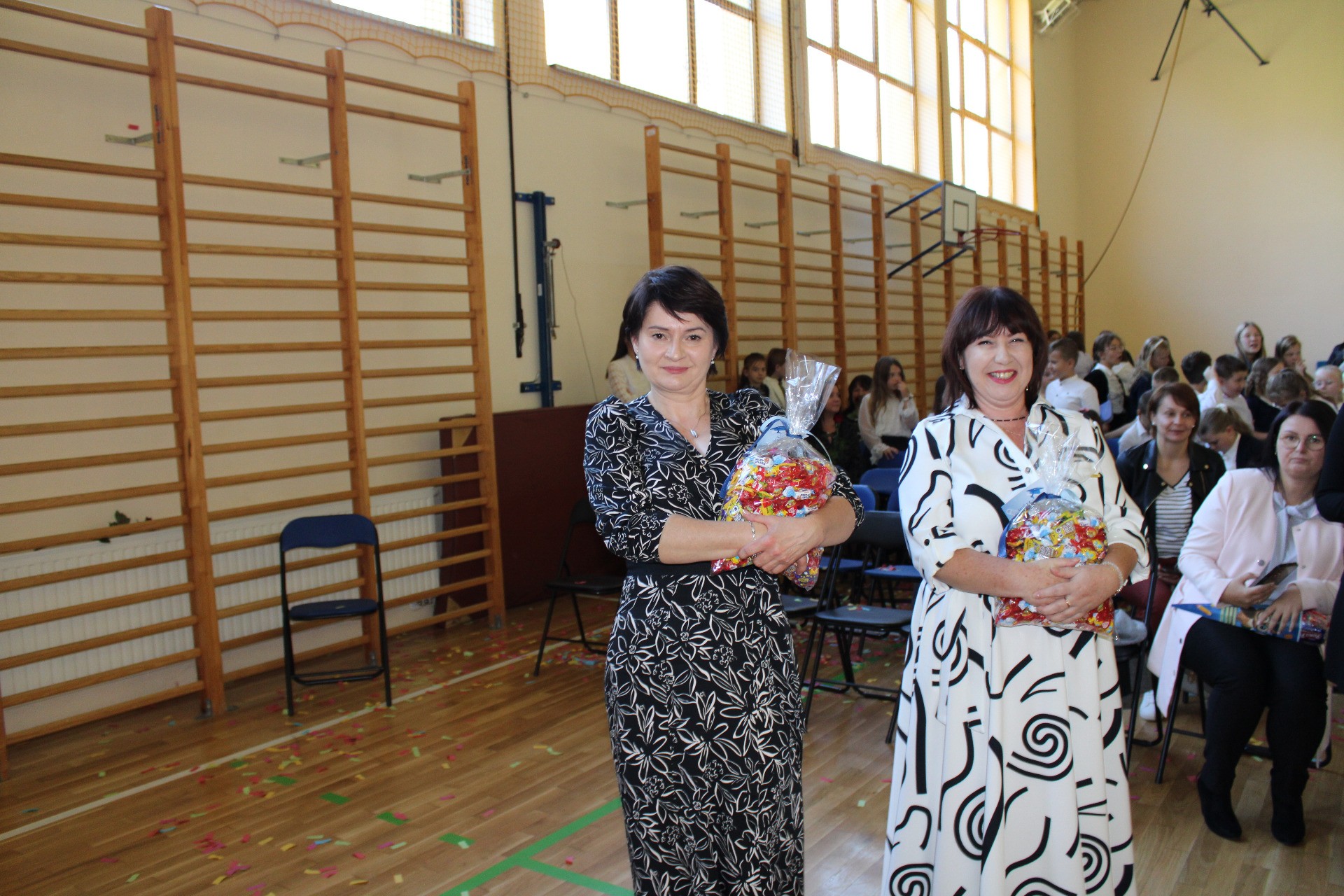 W następnej części akademii przewodniczący Samorządu Uczniowskiego szkoły Marcin W oraz zastępca przewodniczącego Patrycja C złożyli życzenia dla nauczycieli z okazji