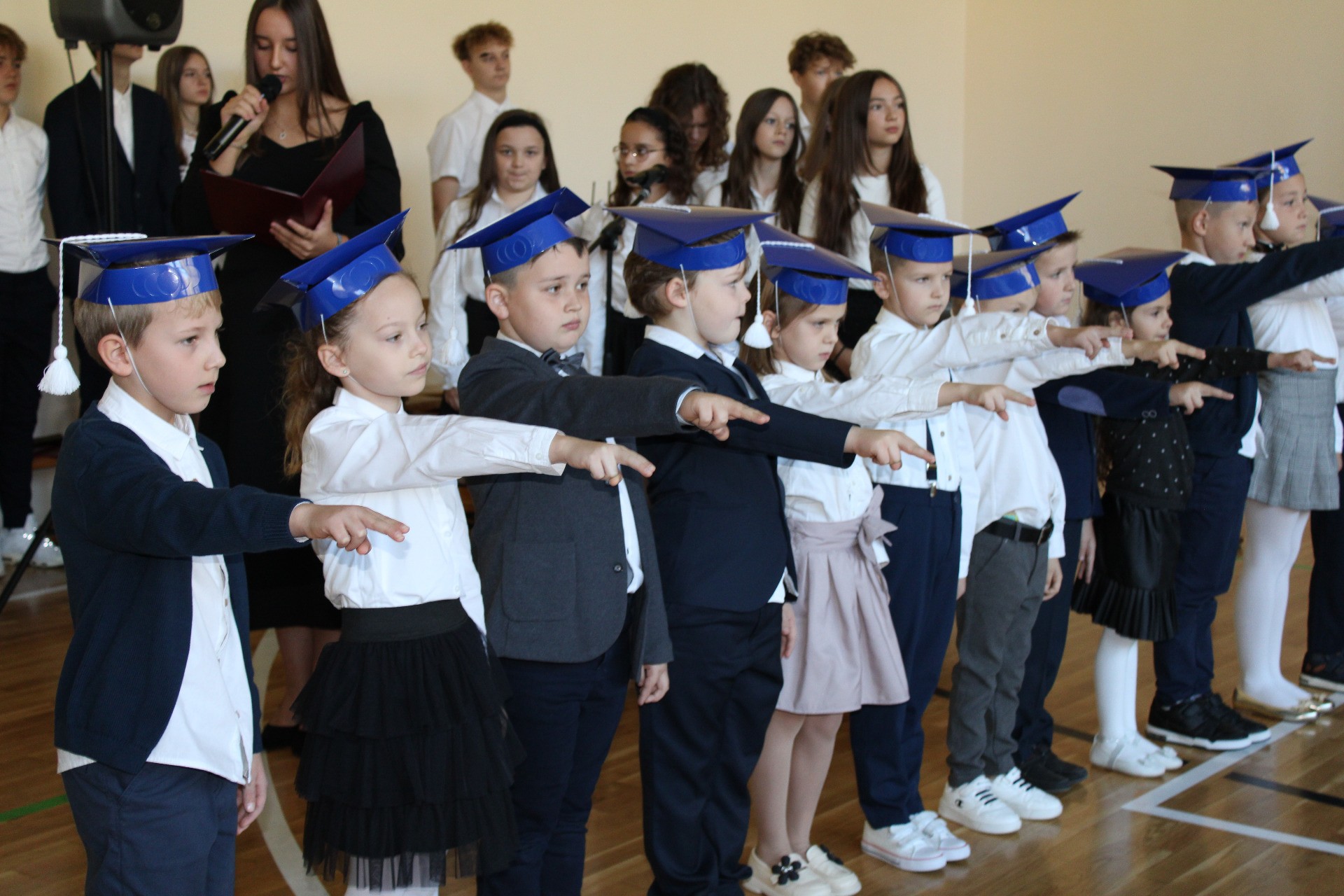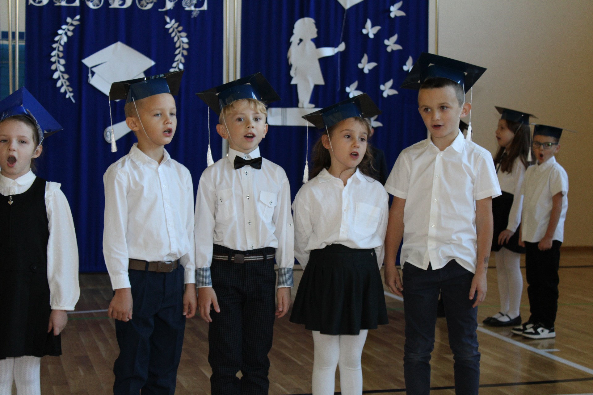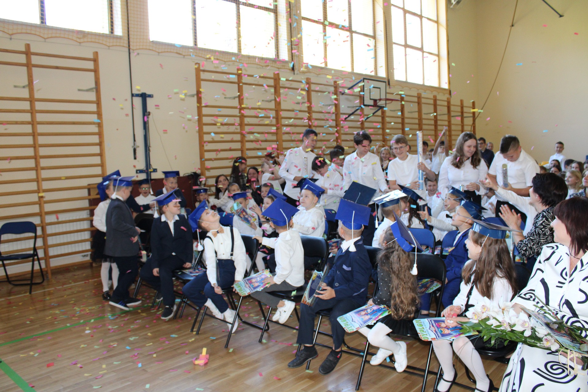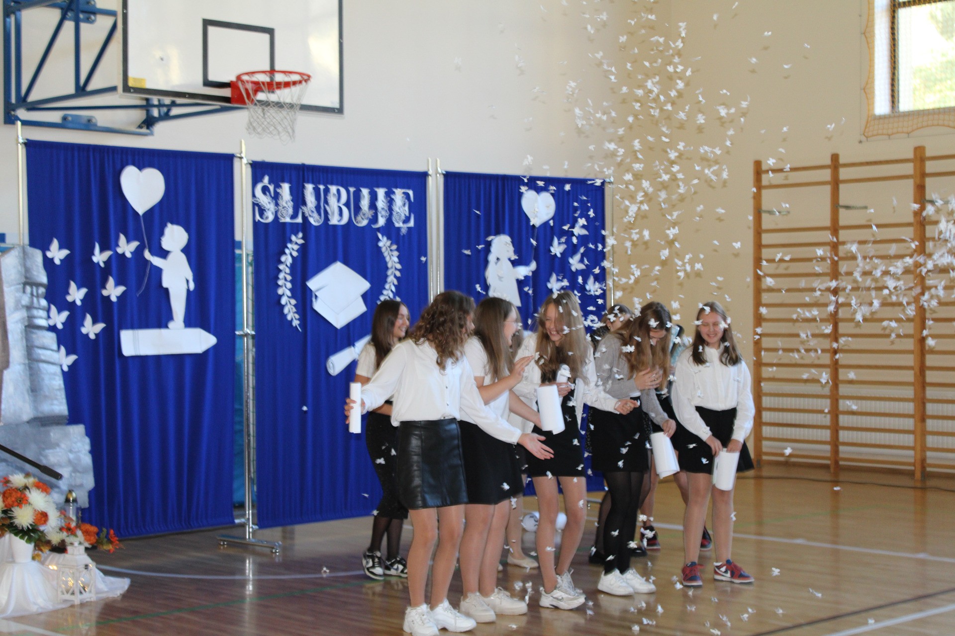 Na zakończenie akademii klasa VII pod kierunkiem wychowawczyni Anny Sekuły w sposób humorystyczny przywitała nowych uczniów klas pierwszych piosenką „Witajcie w naszej bajce” oraz kolorowymi konfetti, które przysporzyły najmłodszym wiele radości i uśmiechu.