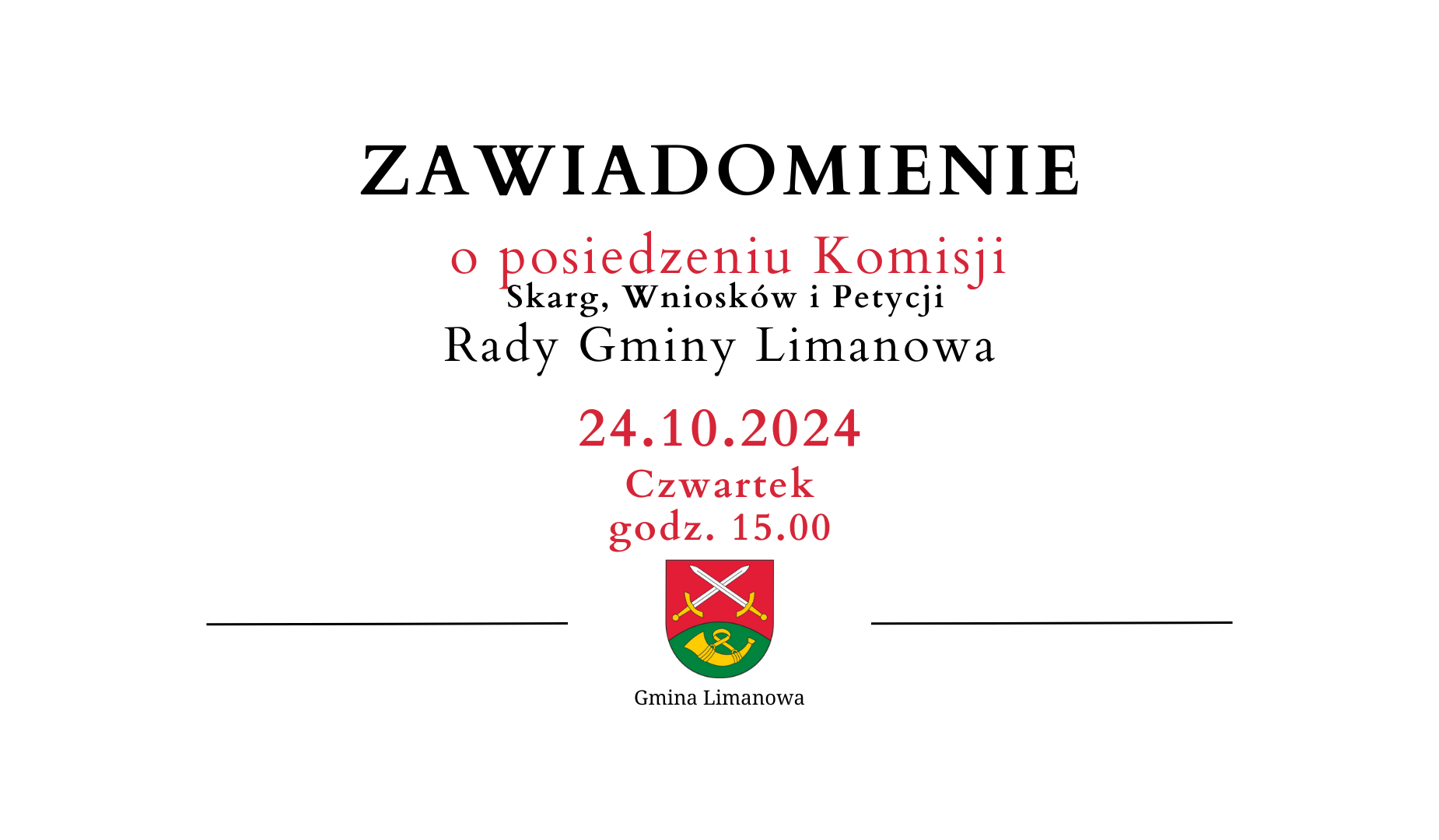Na podstawie § 60 ust. 3 uchwały Nr XXIX/278/2018 Rady Gminy Limanowa z dnia 6 września 2018 r. w sprawie Statutu Gminy Limanowa (Dz. Urz. Woj. Mał. z 2018 r. poz. 6395) zapraszam na posiedzenie Komisji Skarg, Wniosków i Petycji Rady Gminy Limanowa, które odbędzie się w dniu 24 października 2024 r. /czwartek/ o godz. 15.00 w sali konferencyjnej Urzędu Gminy Limanowa.