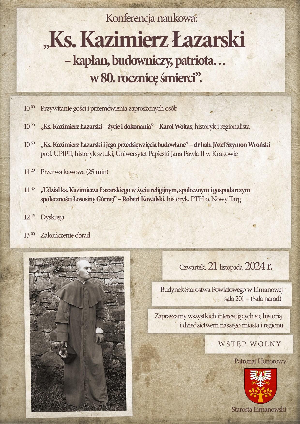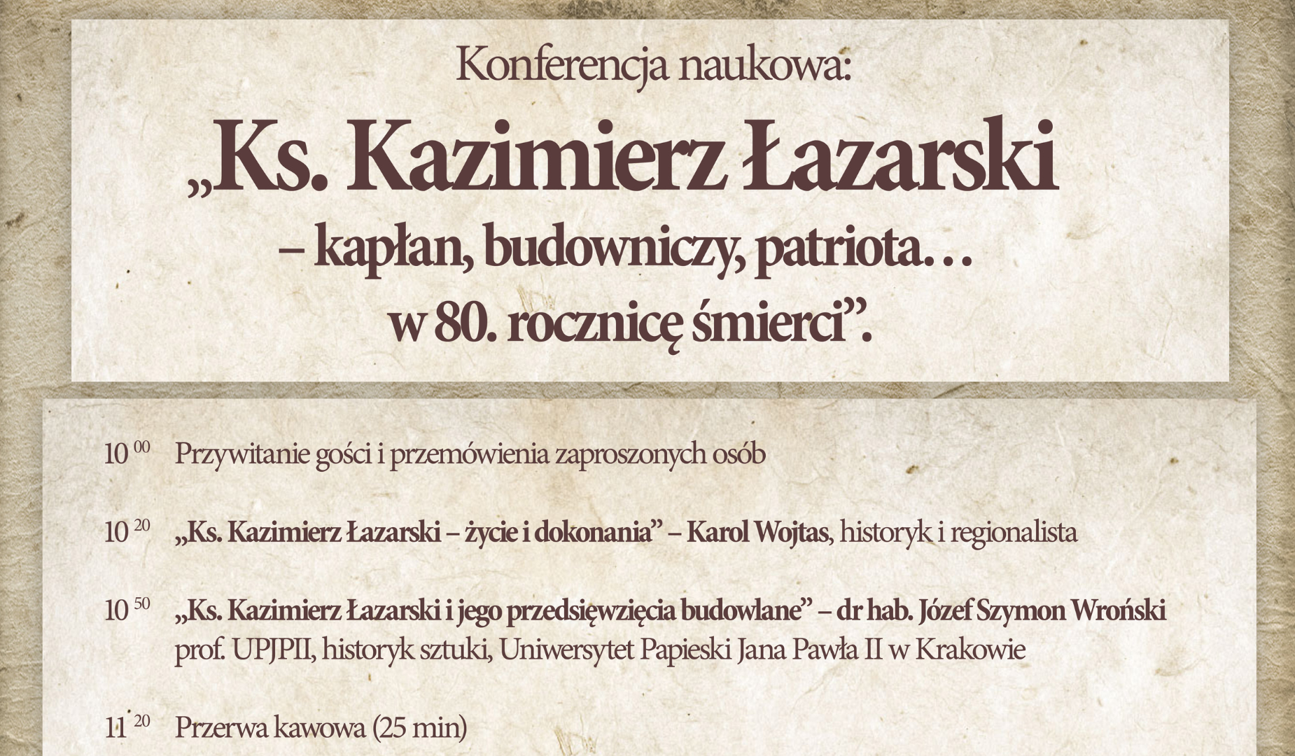 1330 w budynku Starostwa Powiatowego odbędzie się konferencja naukowa poświęcona ks. Łazarskiemu. Referaty na temat życia i działalności ks. Kazimierza Łazarskiego wygłoszą: dr hab. Józef Szymon Wroński – prof. UPJPII w Krakowie, Karol Wojtas – historyk i regionalista, Robert Kowalski – historyk, radny Miasta Limanowa, prezes PTH o. Nowy Targ. Współorganizatorem wydarzenia jest Powiat Limanowski a swoim patronatem konferencję objął Starosta Limanowski.