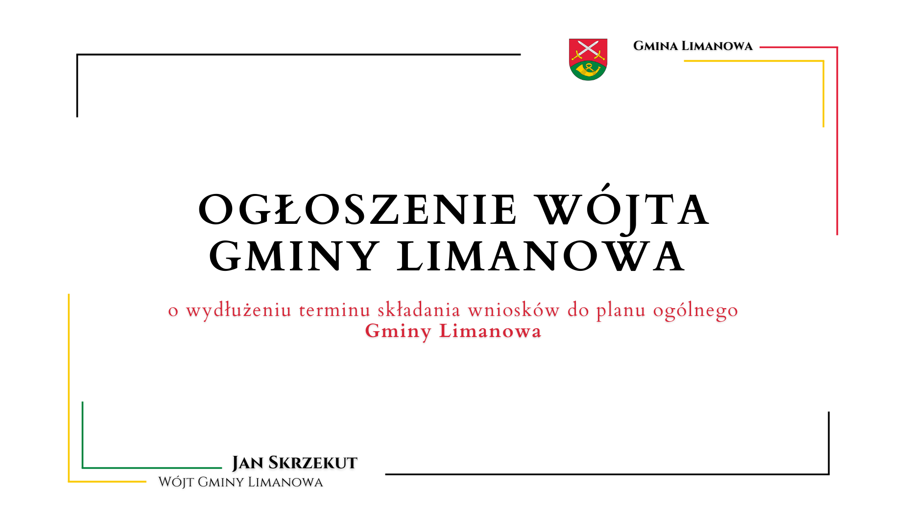 zawiadamiam o wydłużeniu terminu składania wniosków do planu ogólnego Gminy Limanowa – do dnia 18 listopada 2024 r.
