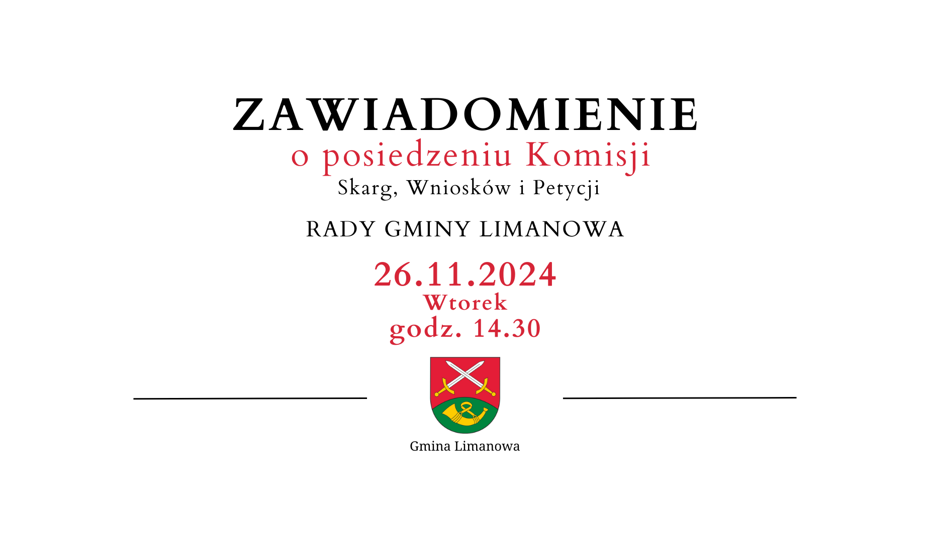 Na podstawie § 60 ust. 3 uchwały Nr XXIX/278/2018 Rady Gminy Limanowa z dnia 6 września 2018 r. w sprawie Statutu Gminy Limanowa (Dz. Urz. Woj. Mał. z 2018 r. poz. 6395) zapraszam na posiedzenie Komisji Skarg, Wniosków i Petycji Rady Gminy Limanowa, które odbędzie się w dniu 26 listopada 2024 r. /wtorek/ o godz. 14.30 w sali konferencyjnej Urzędu Gminy Limanowa.