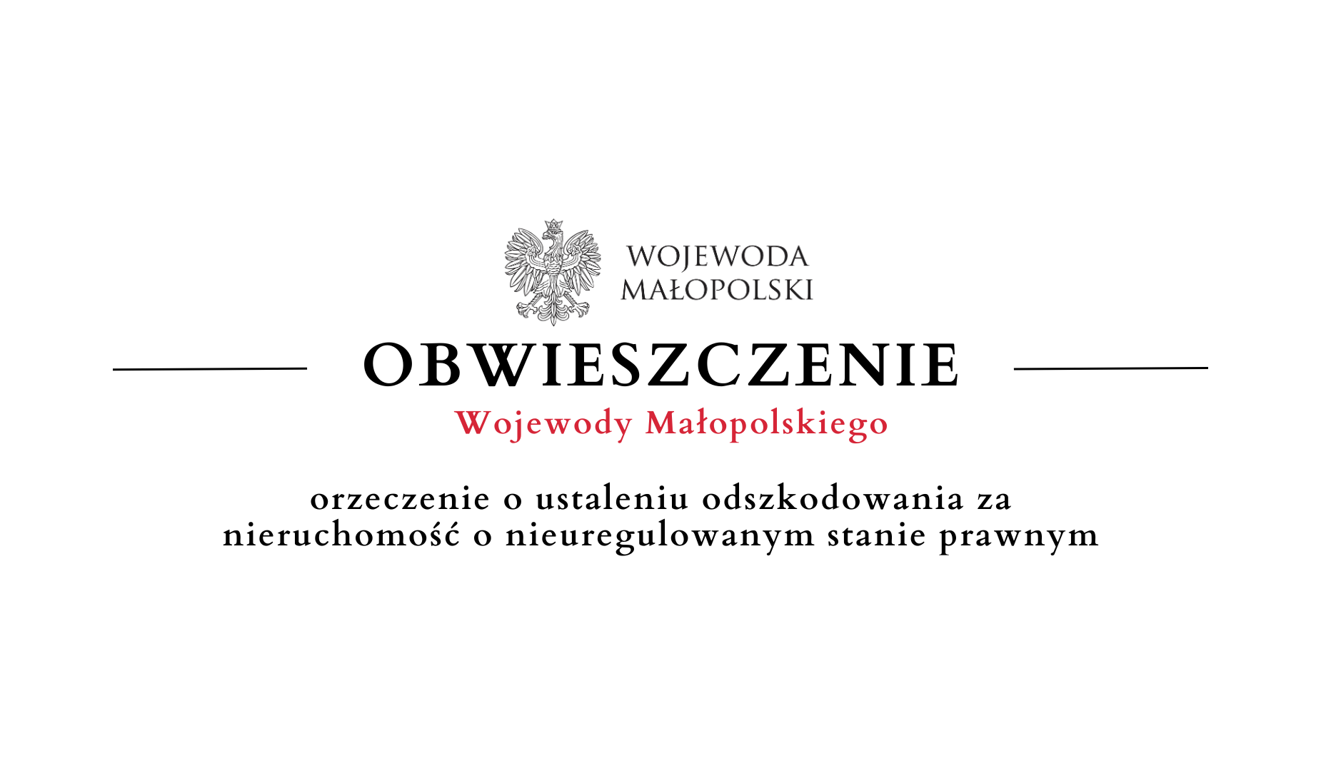 Na podstawie art. 9s ust. 4 ustawy z dnia 28 marca 2003 r. o transporcie kolejowym (tekst jedn. Dz. U. z 2024 r. poz. 697) oraz art. 118a ust. 2 ustawy z dnia 21 sierpnia 1997 r. o gospodarce nieruchomościami (tekst jedn. Dz. U. z 2024 r., poz. 1145) w związku z art. 49 ustawy z dnia 14 czerwca 1960 r. – Kodeks postępowania administracyjnego (tekst jedn. Dz. U. z 2024 r., poz. 572) zawiadamia się, że Wojewoda Małopolski decyzją z dnia 29 listopada 2024 r. znak: WS-II.7570.1.231.2024.RG orzekł o ustaleniu odszkodowania za nieruchomość o nieuregulowanym stanie prawnym, oznaczoną jako dz. ewid. nr 860/4 (powstała z podziału dz. nr 860/2), obr. 0009 Męcina, jedn. ewid. Limanowa - gmina, powiat limanowski, woj. małopolskie, objętą decyzją Wojewody Małopolskiego z dnia 28 października 2022 r., znak: WIIV. 747.2.3.2022 o ustaleniu lokalizacji linii kolejowej dla inwestycji pn.: „Rozbiórka, przebudowa, rozbudowa i budowa obiektu budowlanego pn.: linia kolejowa nr 104 Chabówka - Nowy Sącz na odc. D (…)”, zreformowaną decyzją Ministra Rozwoju i Technologii z dnia 31 lipca 2023 r. znak: DLI-I.7620.50.2022.LB.10. oraz o zobowiązaniu PKP Polskie Linie Kolejowe S.A. do wpłaty do depozytu sądowego ustalonego odszkodowania - na okres dziesięciu lat, jednorazowo, w terminie 14 dni od dnia, w którym decyzja o ustaleniu odszkodowania stanie się ostateczna.