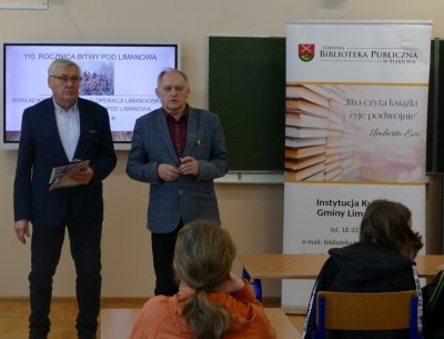 Tego samego dnia wieczorem, o godzinie 18.30 w Gminnej Bibliotece w Starej Wsi, wykład na ten sam temat mogły usłyszeć osoby dorosłe. Na wieczorne spotkanie tłumnie przybyli z uczestnicy zarówno ze Starej Wsi i Limanowej oraz innych okolicznych miejscowości. W spotkaniu wziął również udział Andrzej Wyżycki Radny Gminy Limanowa. Spotkanie rozpoczął dyrektor biblioteki, Jacenty Musiał, który w swoim wystąpieniu podkreślił wagę takich inicjatyw w propagowaniu historii regionu. Zaznaczył, że podobne wydarzenia mają istotne znaczenie dla budowania więzi społecznych i poszerzania wiedzy o przeszłości regionu. Wsparcie dla tej idei wyraził również obecny na wydarzeniu przewodniczący Rady Gminy Limanowa, Daniel Łącki, który wskazał, że znajomość lokalnej historii odgrywa kluczową rolę w kształtowaniu tożsamości oraz postaw patriotycznych mieszkańców. Główną częścią wieczoru była prelekcja Karola Wojtasa połączona z bogatą prezentacją multimedialną. Historyk, który z pasją i dużą wiedzą opowiedział o przebiegu operacji limanowsko-łapanowskiej, jednego z ważniejszych wydarzeń I wojny światowej na terenie naszego regionu zaciekawił wszystkich przybyłych gości. Karol Wojtas między innymi skupił się na przedstawieniu różnych punktów widzenia i znaczenia walk pod Limanową w tym szturmu Jabłońca i Golcowa w zależności, od opcji którą reprezentował opisujący te wydarzenia uczestnik lub świadek wydarzenia czy też korespondent wojenny. Przytoczył wtedy także fragmenty relacji Ferenca Molnara, generała Josefa Rotha czy Józefa Piłsudskiego. Zaprezentowane zostały także archiwalne fotografie. Karol Wojtas zwrócił także uwagę, że od roku przy cmentarzu wojennym nr 369 na Golcowie znajduję się nowa tablica informacyjno – edukacyjna o tym cmentarzu a także walkach o Golców. Tablicę tą opracowali dr Piotr Sadowski, Karol Wojtas oraz Damian Król. Ciekawym uzupełnieniem wykładu były wizje artystyczne inspirowane bitwą – obrazy i utwory, które ukazują dramatyzm wydarzeń w sposób symboliczny. Podczas spotkania odkryto wiele nowych faktów związanych z Bitwą Limanowską oraz zrewidowano dotychczasowe błędne przekonania utrwalone w literaturze historycznej, ale też w popularnej a także w przewodnikach turystycznych. Warto podkreślić, że Karol Wojtas swoją pracę wykonał nieodpłatnie, co dodatkowo świadczy o jego pasji i oddaniu dla promowania historii regionu. Wystąpienie nie tylko wzbogaciło wiedzę historyczną, ale także podniosło rangę obchodów 110. rocznicy Bitwy Limanowskiej, stając się jednym z kluczowych wydarzeń upamiętniających tę ważną kartę naszej przeszłości w Gminie Limanowa.