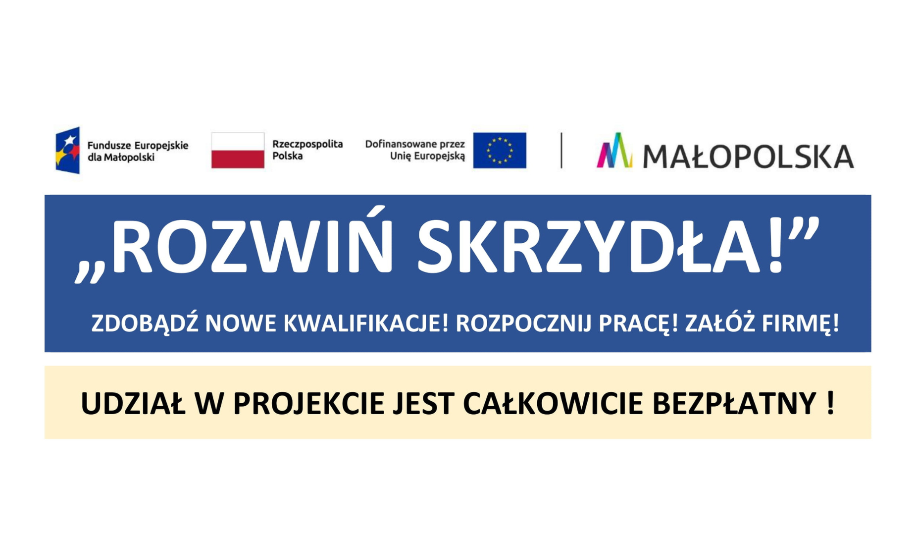Fundacja Rozwoju Kompetencji i Przedsiębiorczości PROAKTYWNI zaprasza do udziału w X edycji projektu „Rozwiń SKRZYDŁA!”, współfinansowanego ze środków Europejskiego Funduszu Społecznego Plus w ramach programu Fundusze Europejskie dla Małopolski 2021-2027, Priorytetu 6. Fundusze europejskie dla rynku pracy, edukacji i włączenia społecznego, Działania 6.6 Rozwój kompetencji kadr i adaptacja do zmian.
