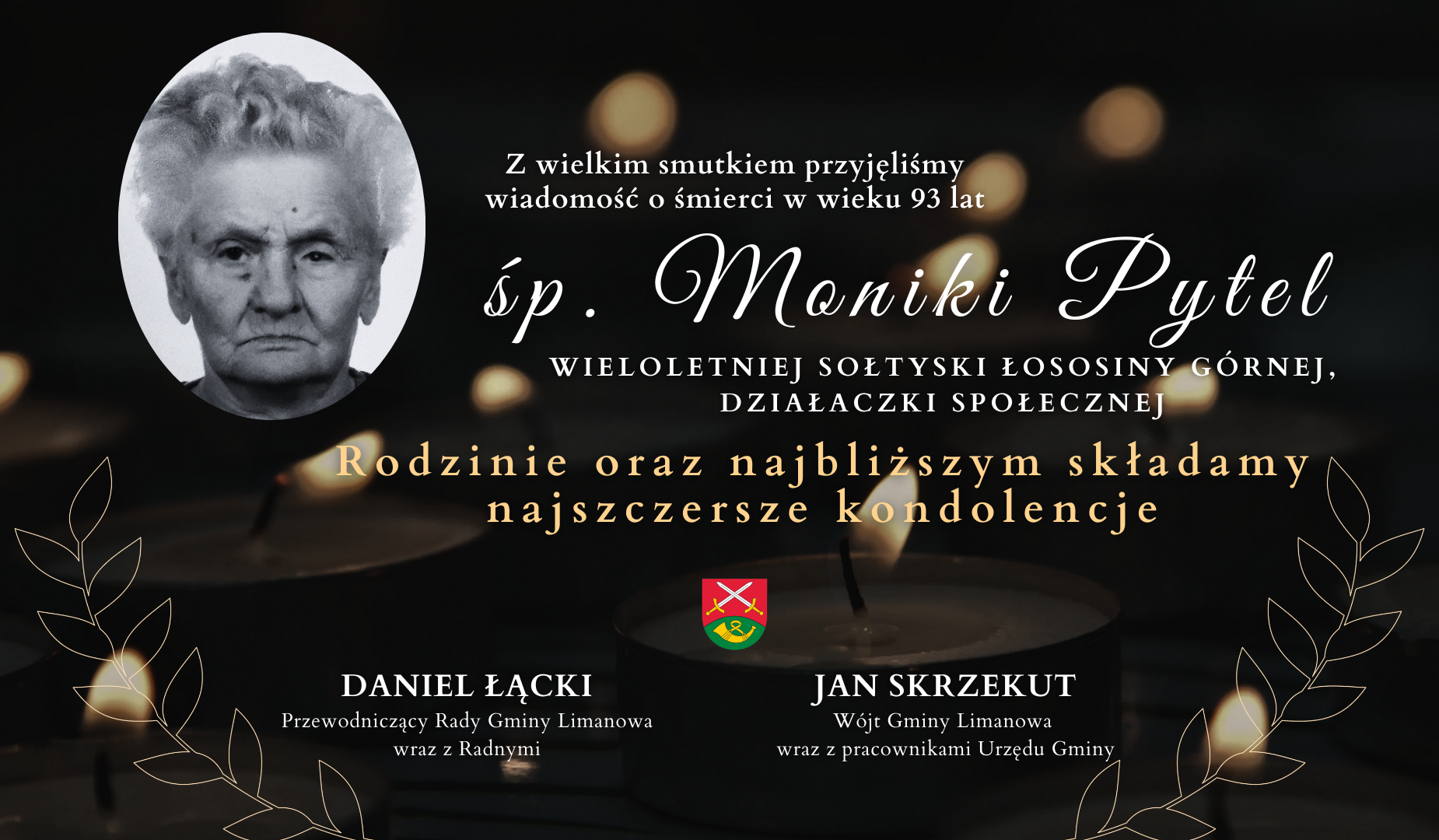 Z wielkim smutkiem przyjęliśmy wiadomość o śmierci w wieku 93 lat śp. Moniki Pytel. Zasłużonej działaczki społecznej, wieloletniego sołtysa miejscowości łososona Górna.