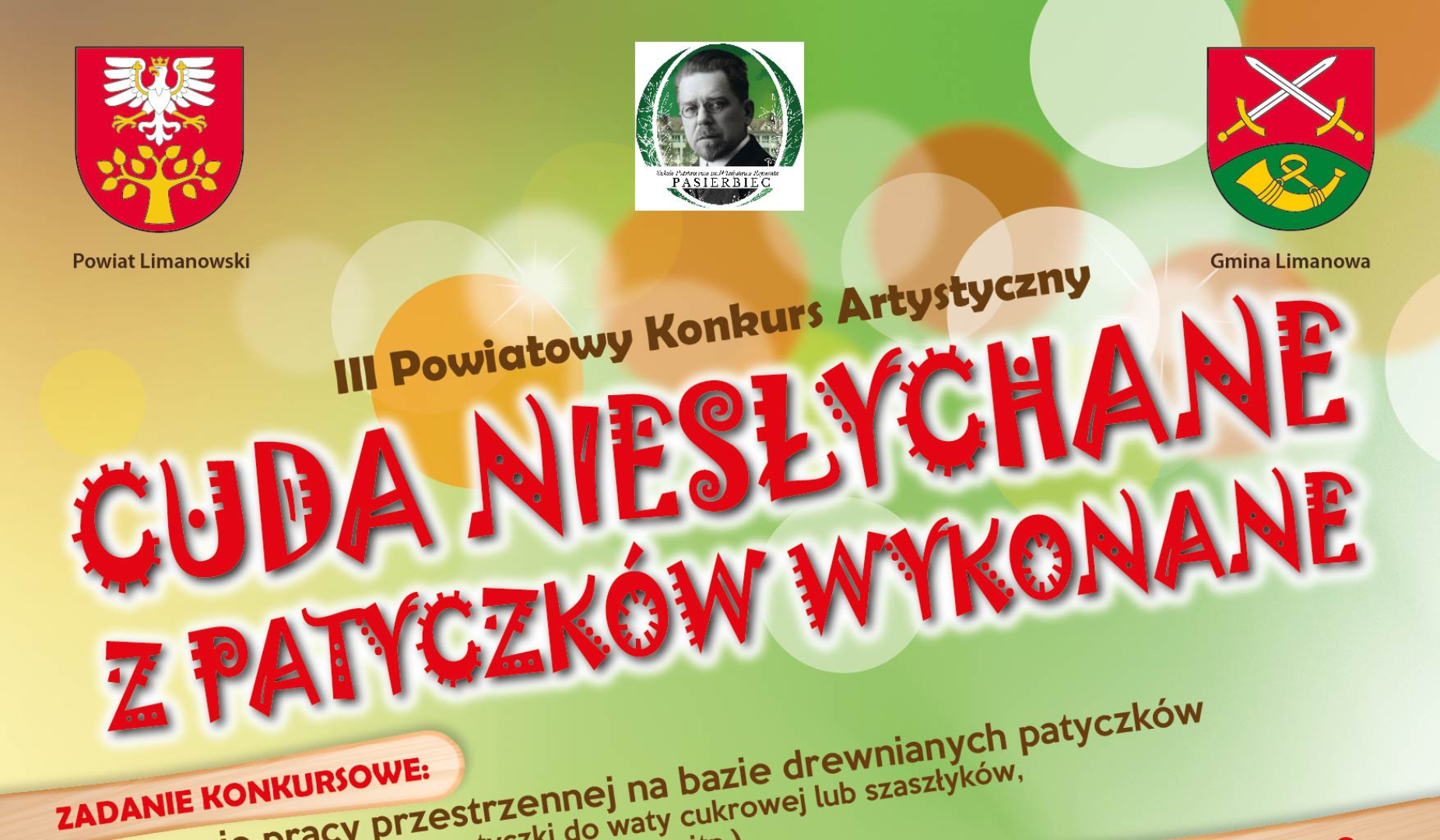 Szkoła Podstawowa im. Władysława Reymonta w Pasierbcu zaprasza do udziału w III Powiatowym Konkursie Artystycznym CUDA NIESŁYCHANE Z PATYCZKÓW WYKONANE, uczniów klas 1-6 ze szkół podstawowych z terenu powiatu limanowskiego.