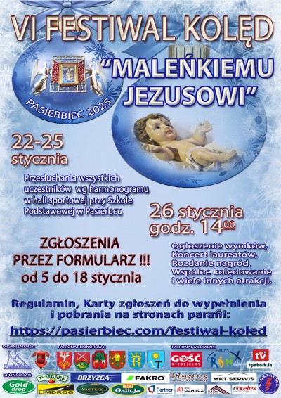 Sanktuarium Matki Bożej Pocieszenia w Pasierbcu zaprasza dzieci i młodzież w każdym wieku do wzięcia udziału w VI Festiwalu Kolęd “Maleńkiemu Jezusowi”, który odbędzie się 26 stycznia o godzinie 14.00.