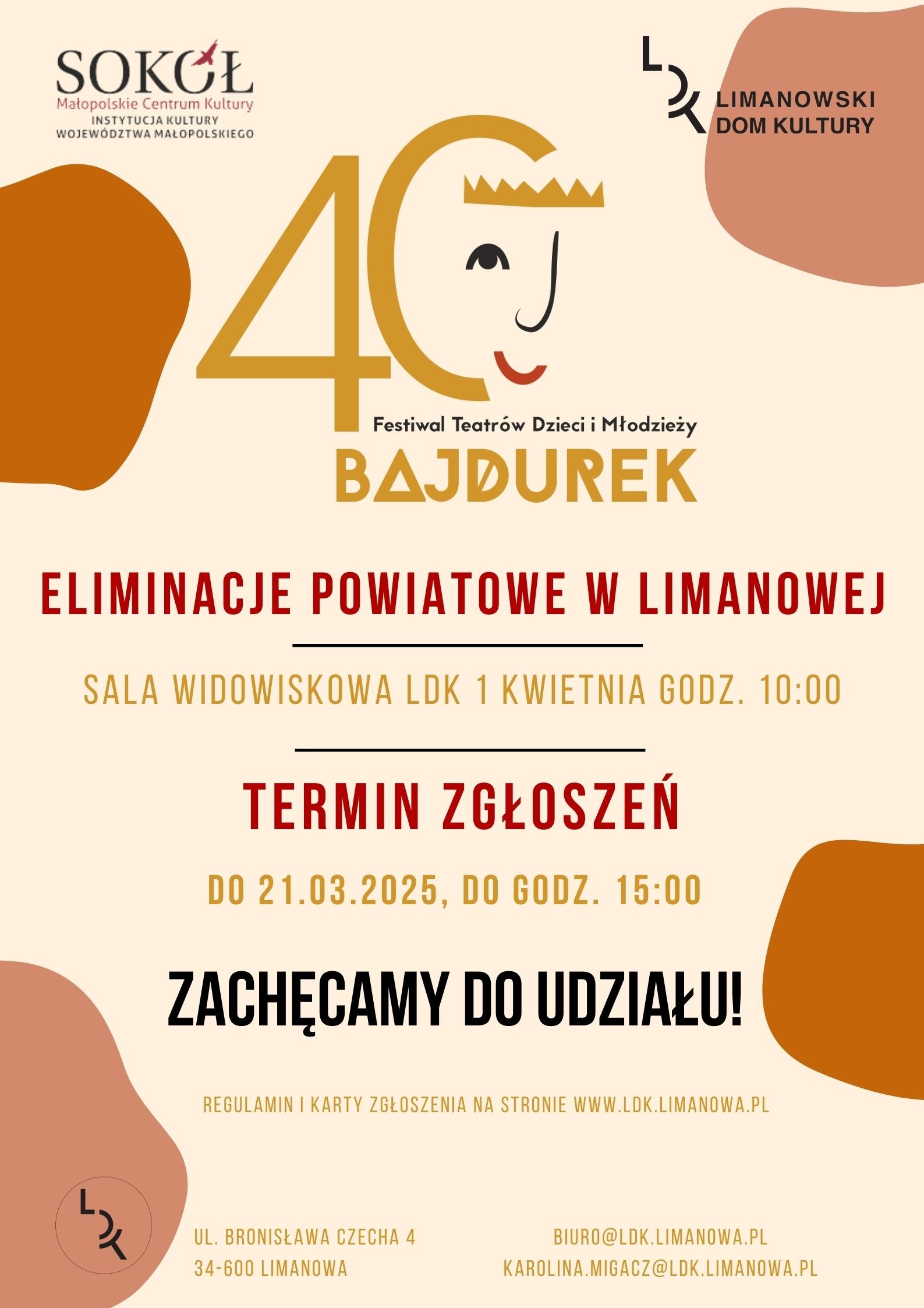 Limanowski Dom Kultury wraz z Małopolskim Centrum Kultury SOKÓŁ zachęca do udziału w eliminacjach powiatowych 40. Festiwalu Teatrów Dzieci i Młodzieży BAJDUREK organizowanego dla powiatu limanowskiego.