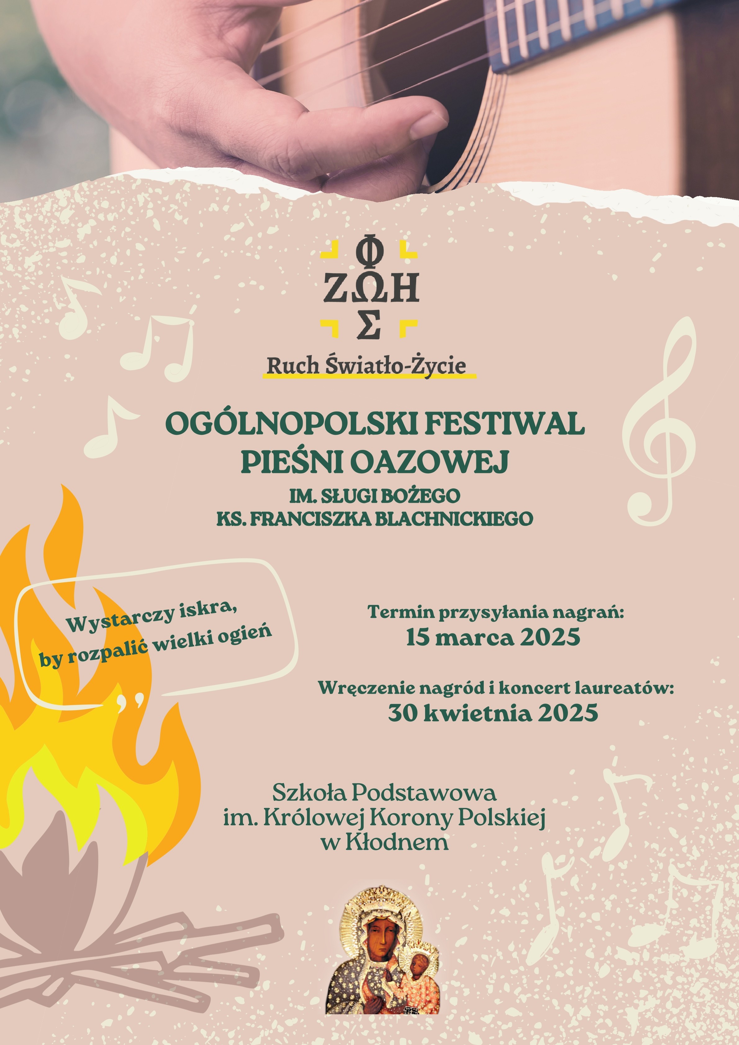 W imieniu organizatorów serdecznie zapraszamy do udziału w Ogólnopolskim Festiwalu Pieśni Oazowej im. Sługi Bożego ks. Franciszka Blachnickiego organizowanego przez Szkołę Podstawową im. Królowej Korony Polskiej w Kłodnem.