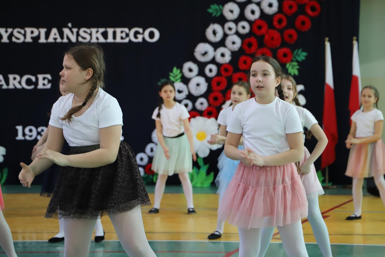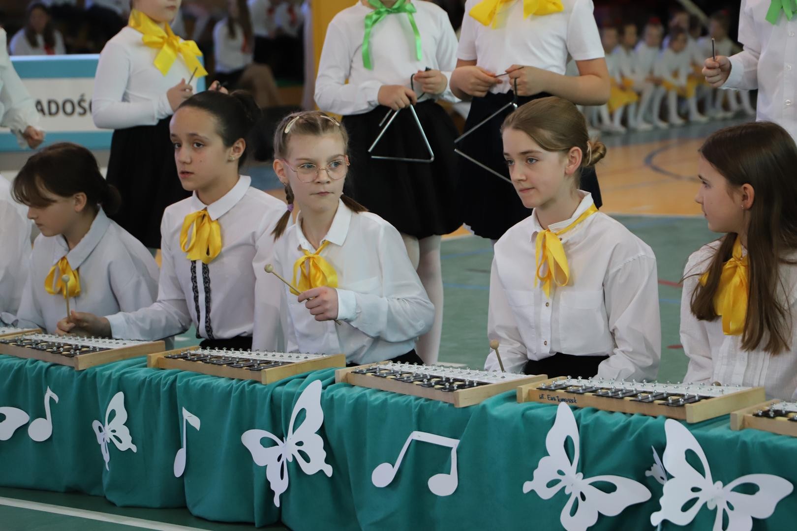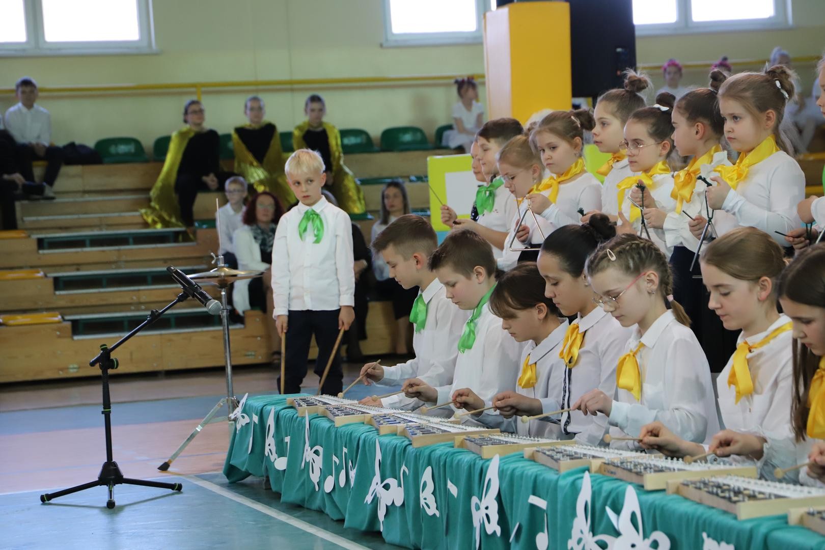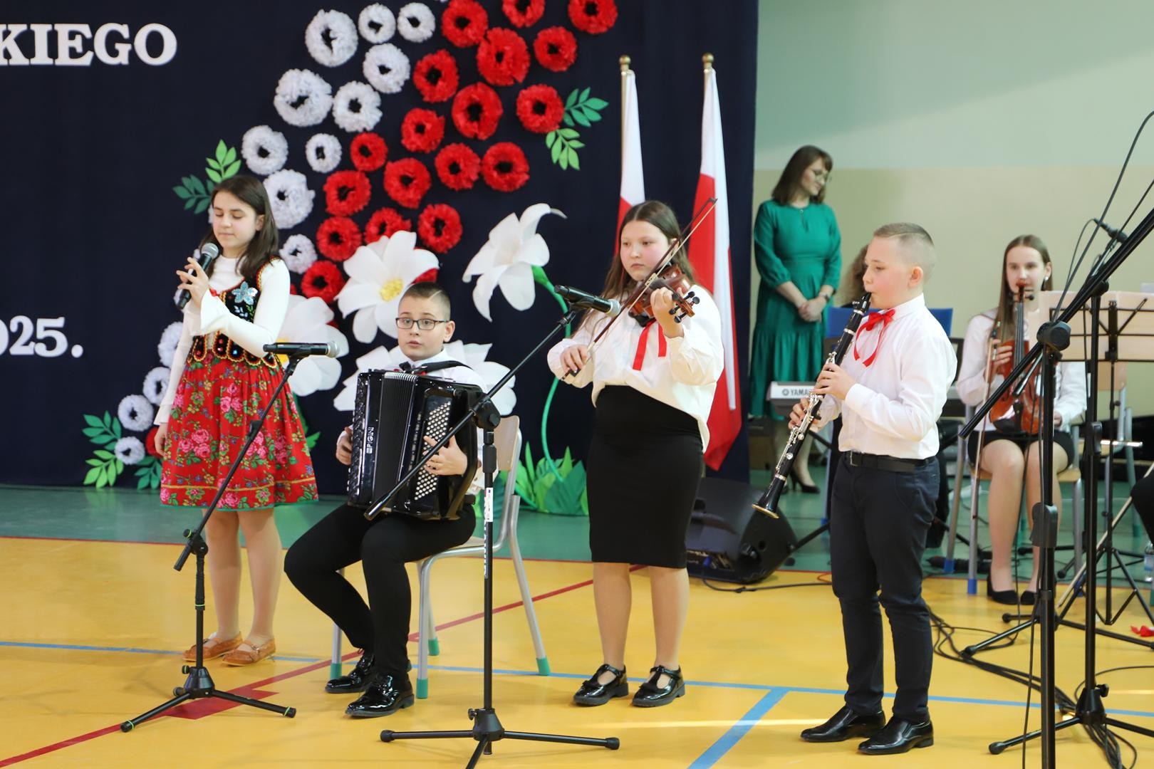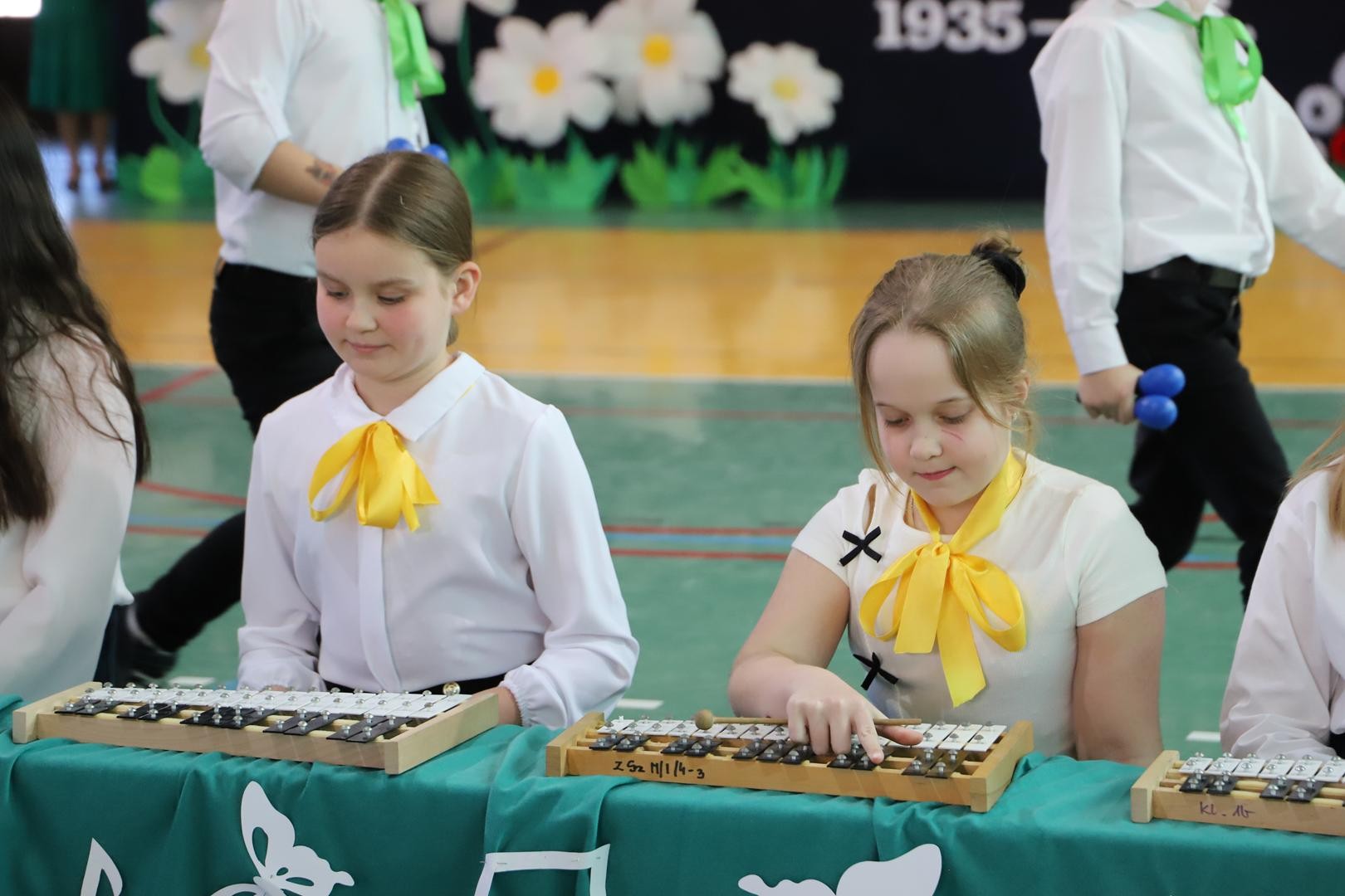 tańcami, grą na instrumentach, śpiewem, układami choreograficznymi, recytacjami. W trakcie uroczystości młodzież w sposób symboliczny budowała szkołę za pomocą cegiełek – wartości: historii, talentów, wdzięczności, pamięci, radości, współdziałania itp. Każdej cegiełce budowanej szkoły towarzyszył występ dzieci lub młodzieży przygotowanej przez nauczycieli: Kazimierę Biernat, Edytę Odziomek, Magdalenę Kindlik, Marzenę Kasprzyk Dudek, Ewę Tomaszek, Agatę Tomerę, Sylwię Tątę.