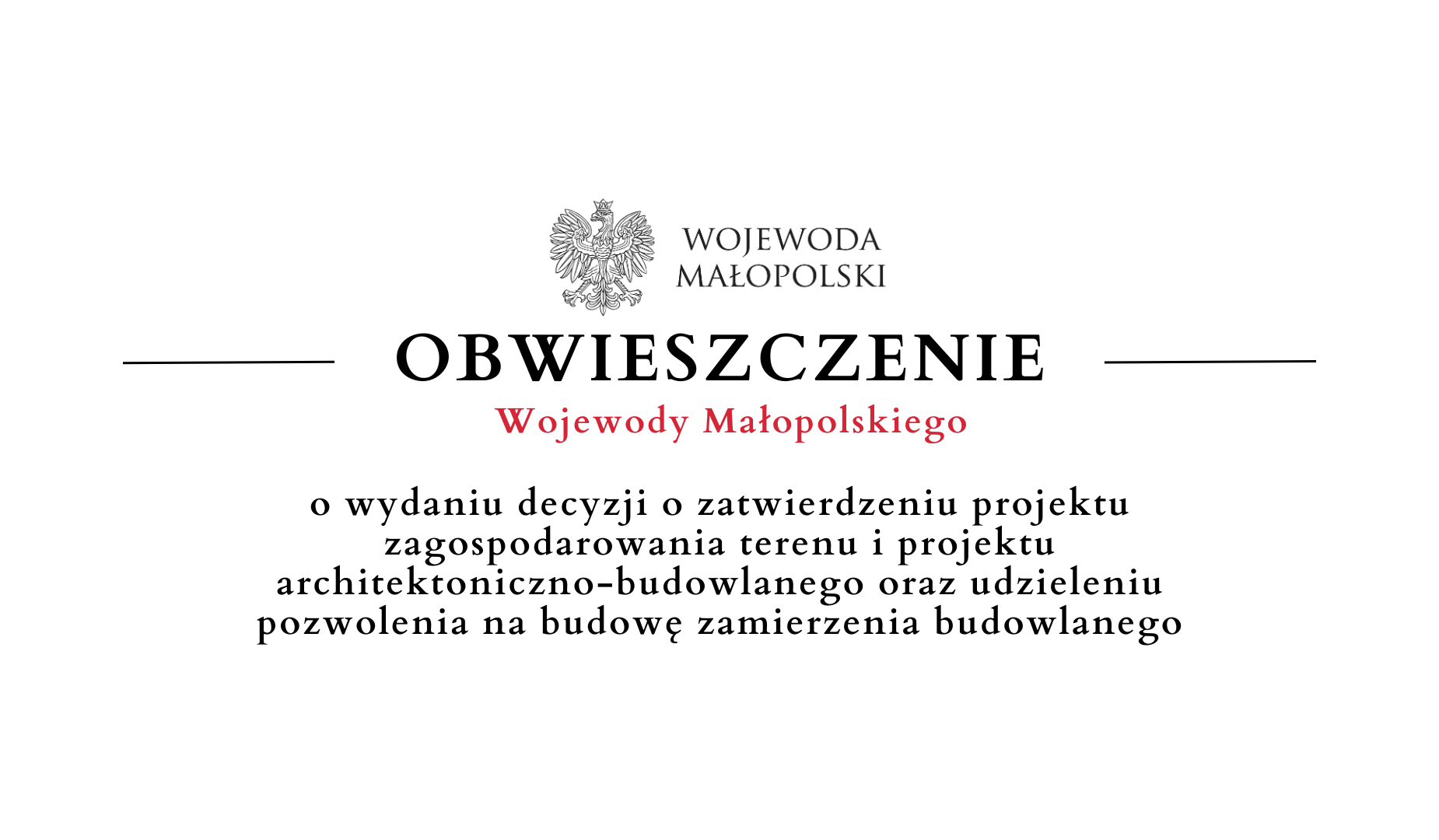 zawiadamia o wydaniu 26 marca 2025 r. decyzji Nr 6/BK/2025 znak: WIII.7840.1.50.2024.MAP o zatwierdzeniu projektu zagospodarowania terenu i projektu architektoniczno-budowlanego oraz udzieleniu pozwolenia na budowę zamierzenia budowlanego pn.: Budowa linii 110 kV kablowej zasilającej dla nowej Podstacji Trakcyjnej Pisarzowa realizowanej w ramach projektu pn.: "Budowa nowej linii kolejowej Podłęże - Szczyrzyc - Tymbark/Mszana Dolna oraz modernizacja istniejącej linii kolejowej nr 104 Chabówka - Nowy Sącz" na odcinku od km 59+950 (km istn. 62,620) do km 55+320 (km istn. 57,040) - ETAP NR 1.