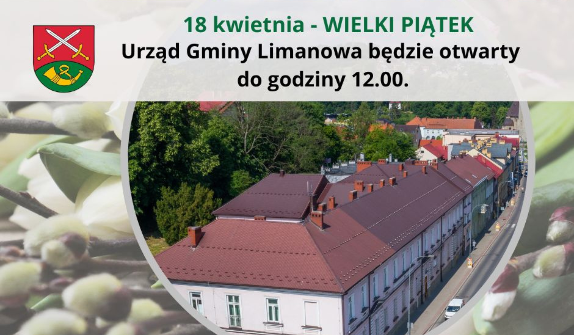 Uprzejmie informujemy, że skrócone będą godziny pracy Urzędu Gminy Limanowa dnia 18 kwietnia 2025 r. (Wielki Piątek). Urząd otwarty będzie w godzinach  7:30-12:00.