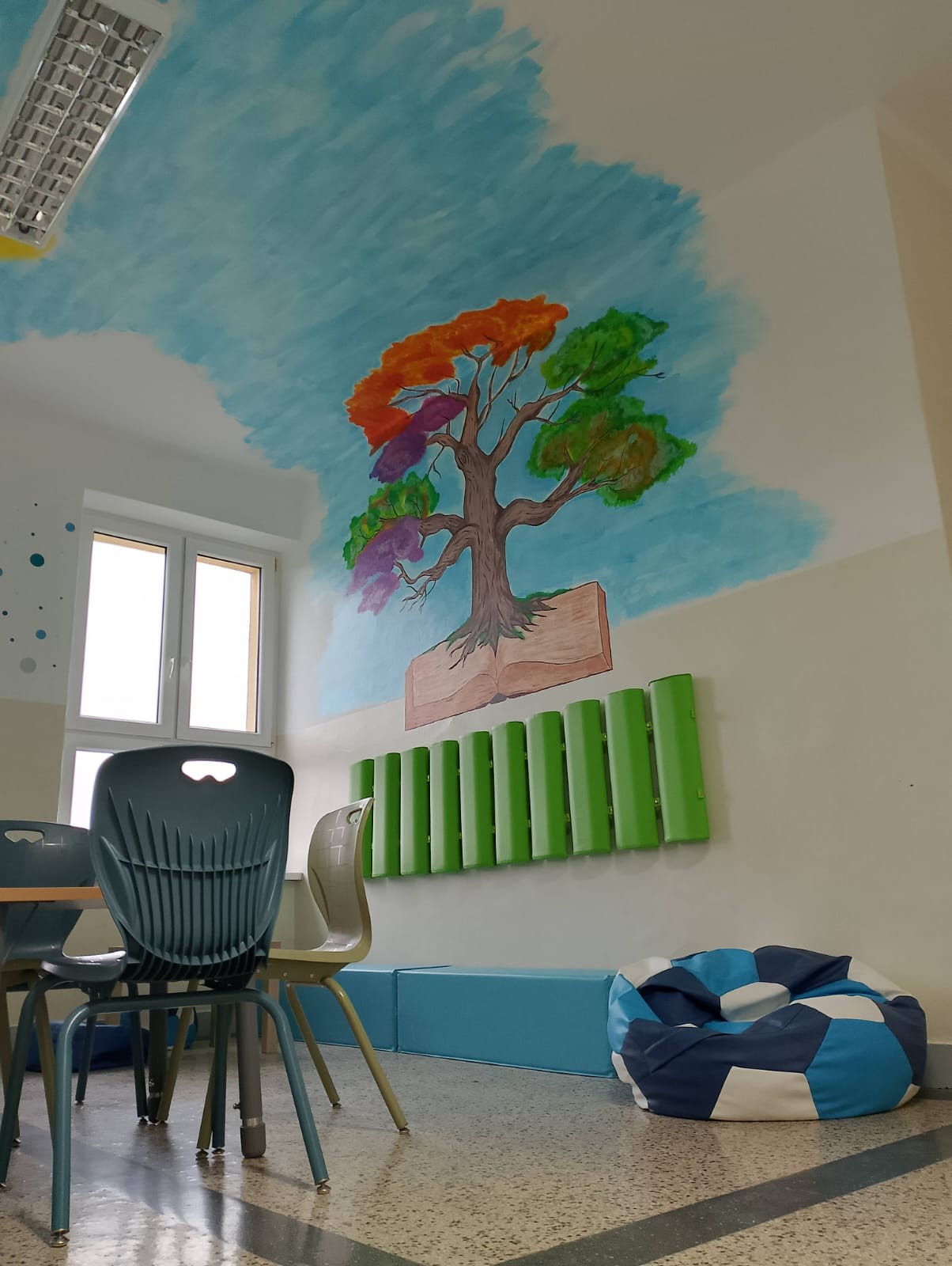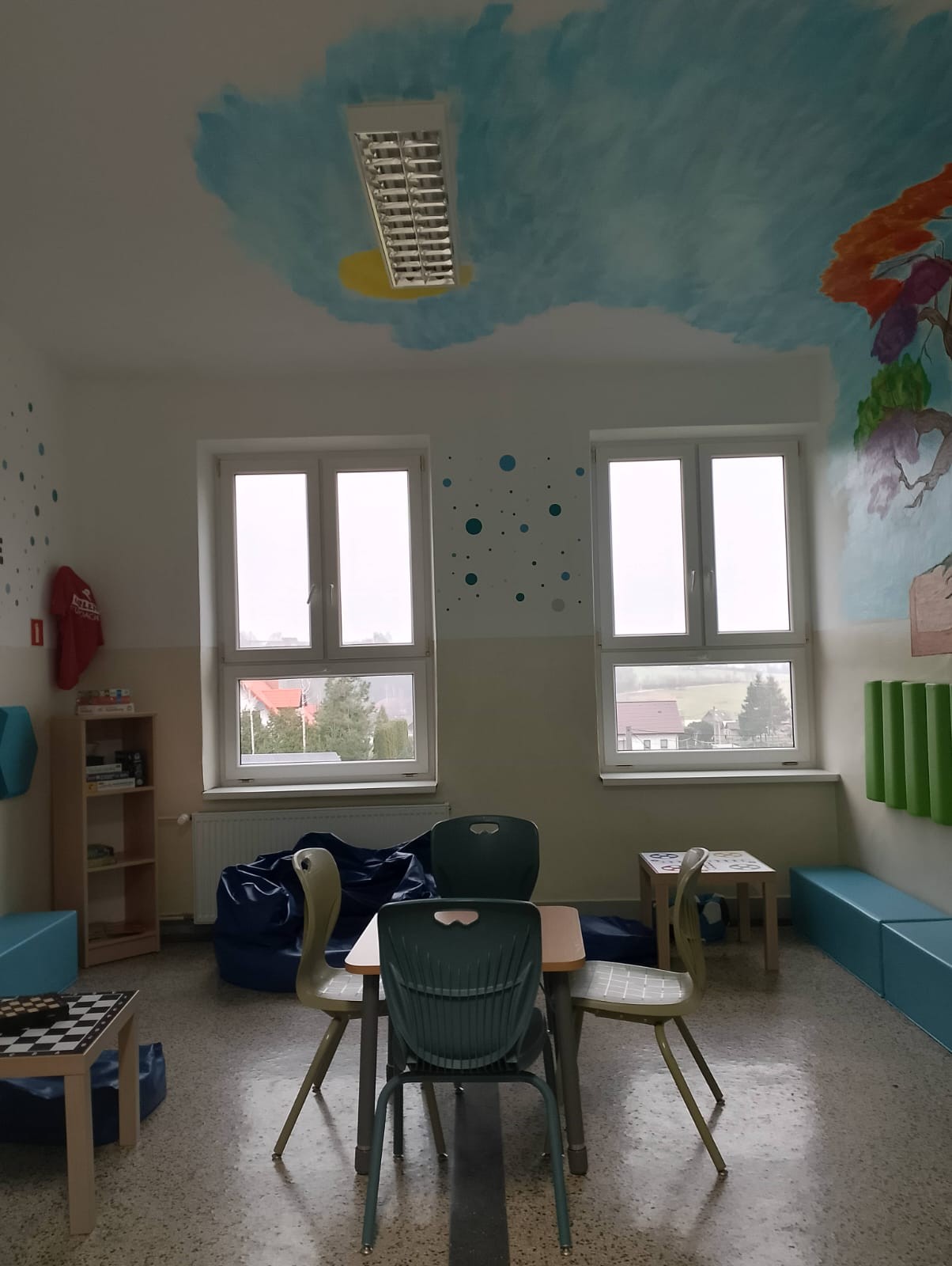 Strefa relaksu została urządzona w specjalnie zaadaptowanym miejscu. Znalazły się w niej m.in. wygodne pufy i fotele, lampki emitujące ciepłe światło, książki, gry planszowe, stoliki i krzesełka oraz maty wyciszające. Główną ozdobą tego miejsca jest mural, wykonany własnoręcznie przez Katarzynę Stalmach, która zadbała o najdrobniejszy szczegół wizualny, spędzając wiele godzin przy tworzeniu swojego działa. Całość tego kącika została zaprojektowana z myślą o komforcie i potrzebach młodych ludzi.