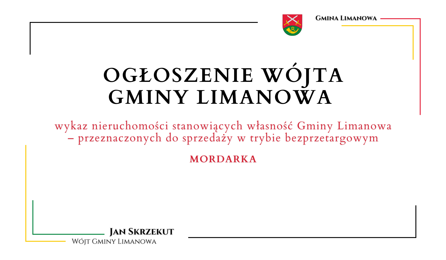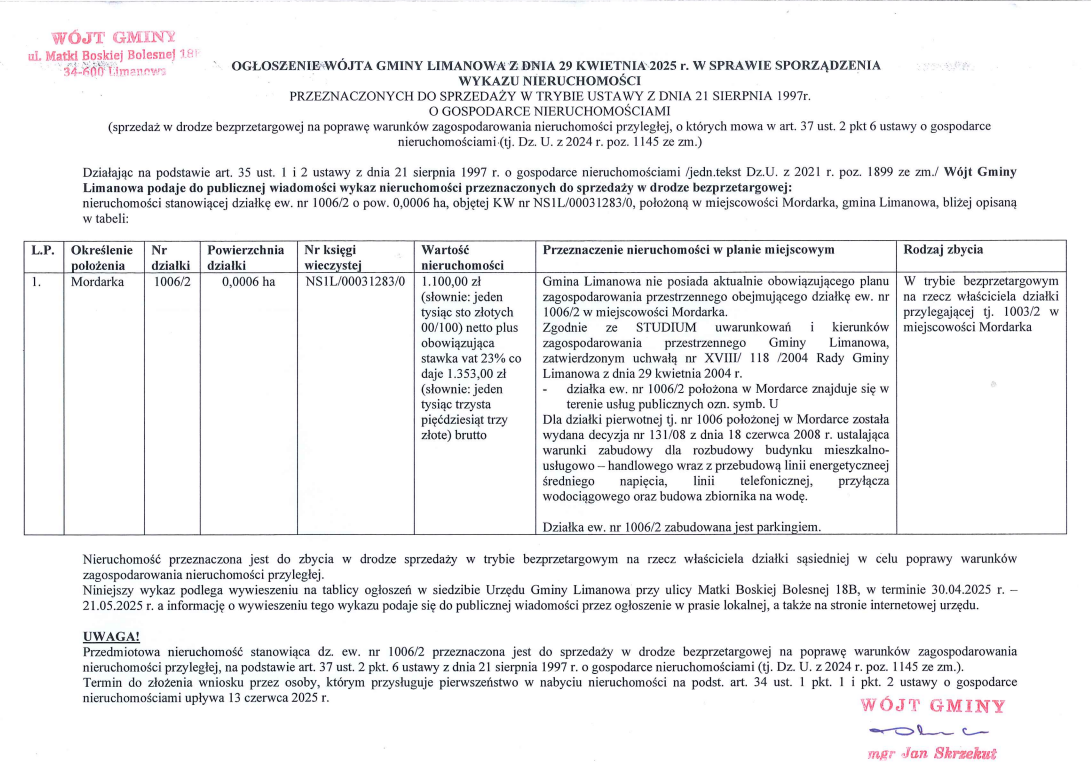 informuje, że na tablicy ogłoszeń Urzędu Gminy Limanowa, przy ul. M. B. Bolesnej 18B, 34-600 Limanowa, w okresie 30.04.2025 r. – 21.05.2025 r. został podany do publicznej wiadomości wykaz nieruchomości stanowiących własność Gminy Limanowa – przeznaczonych do sprzedaży w trybie bezprzetargowym nieruchomość stanowiąca działkę ew. nr 1006/2 o pow. 0,0006 ha, objętą KW nr NS1L/00031283/0, położoną w miejscowości Mordarka, przeznaczona do sprzedaży w trybie bezprzetargowym na rzecz właściciela działki sąsiedniej w celu poprawy warunków zagospodarowania nieruchomości przyległej, o których mowa w art. 37 ust. 2 pkt 6 ustawy o gospodarce nieruchomościami (tj. Dz. U. z 2024 r. poz. 1145 ze zm.)