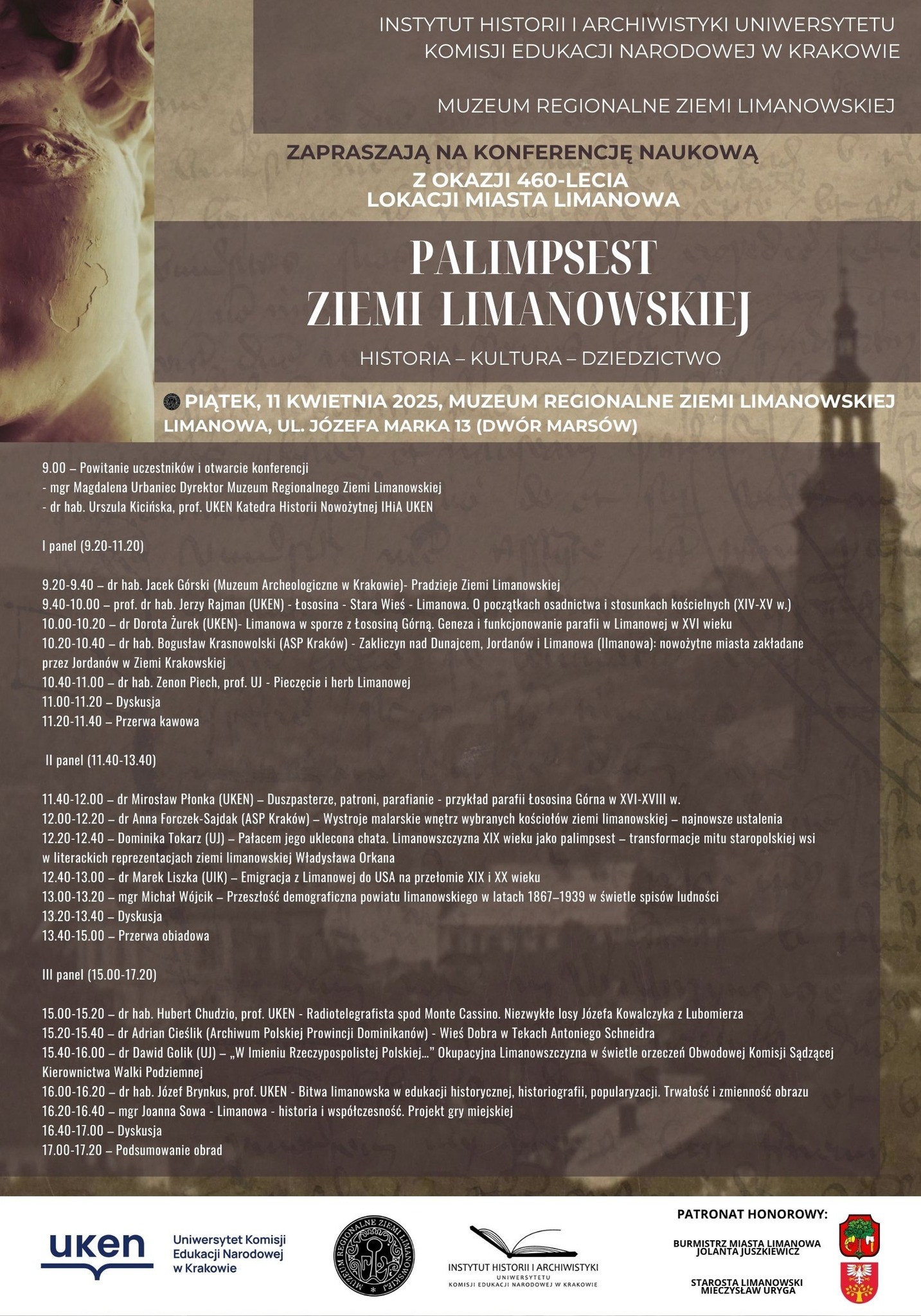 Konferencja organizowana jest z okazji 460. rocznicy nadania praw miejskich Limanowej i stanowi wyjątkową okazję do zgłębienia dziejów, tradycji oraz dziedzictwa tej części Małopolski. Honorowy patronat nad wydarzeniem objęła Jolanta Juszkiewicz - burmistrz miasta Limanowa, oraz Mieczysław Uryga - starosta powiatu limanowskiego.