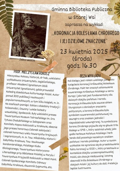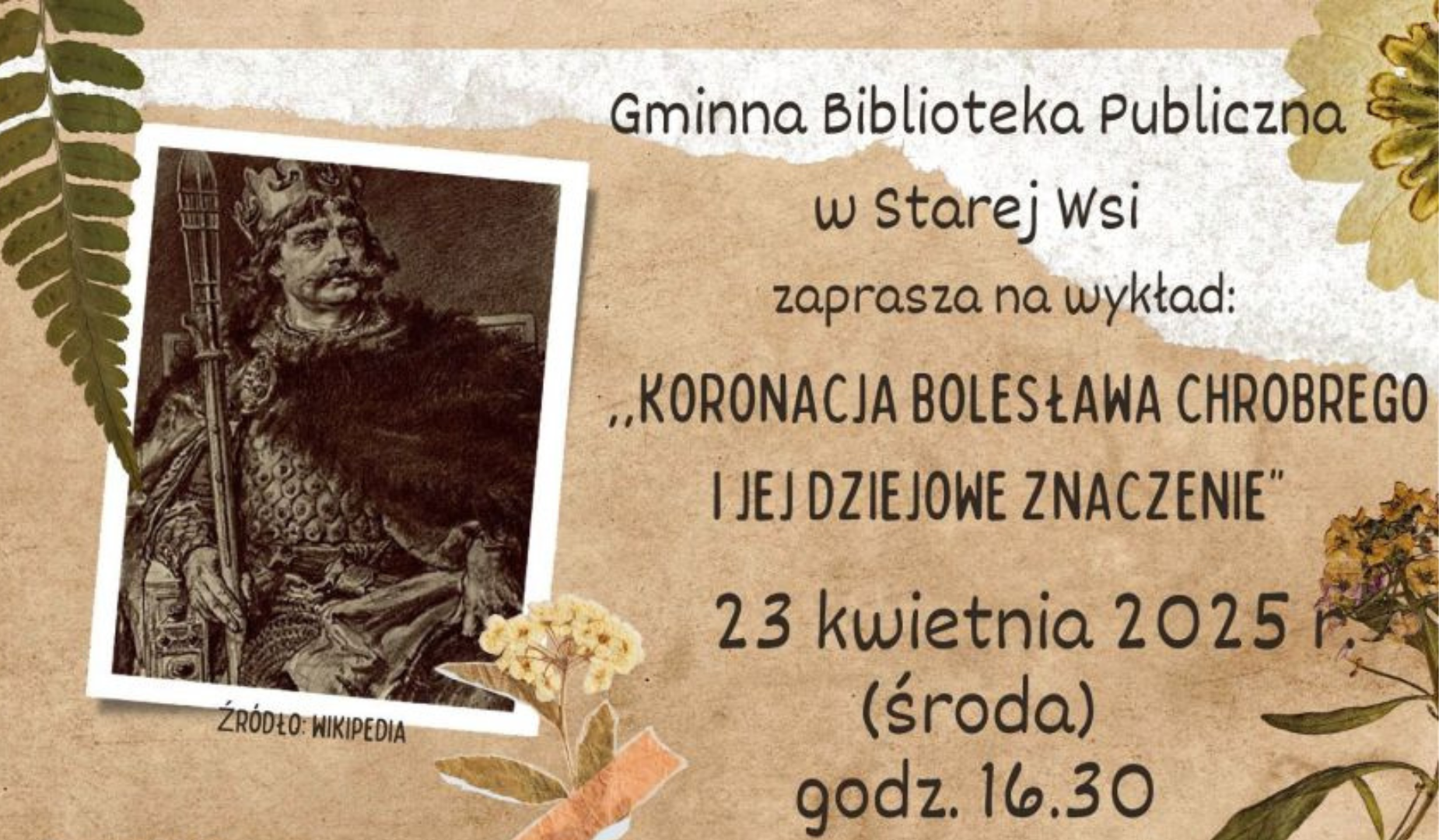 Z okazji jubileuszu 1000-lecia koronacji Bolesława Chrobrego Gminna Biblioteka Publiczna w Starej Wsi serdecznie zaprasza wszystkich 23 kwietnia (środa) na godz. 16.30 na wykład pt.: „Koronacja Bolesława Chrobrego i jej dziejowe znaczenie” który wygłosi prof. dr hab. Mieczysław Rokosz historyk, wieloletni wykładowca Uniwersytetu Jagiellońskiego, profesor Uniwersytetu Ignatianum, autor ponad 300 publikacji naukowych i popularnonaukowych, wybitny znawca polskiego dziedzictwa kulturowego, społecznik i działacz wielu organizacji kulturalnych.