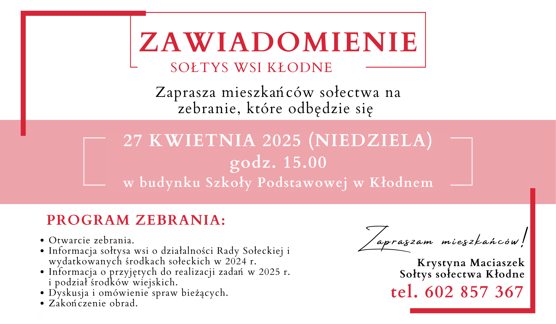 Sołtys wsi Kłodne zaprasza mieszkańców sołectwa na zebranie wiejskie, które odbędzie się w dniu 27 kwietnia 2025 r. /niedzielao godz. 1500 w budynku Szkoły Podstawowej w Kłodnem.