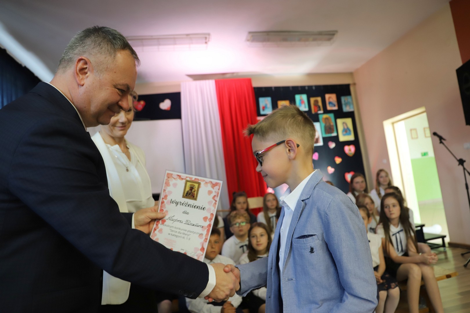 W dalszej części obchodów odbyło się rozstrzygnięcie konkursów plastycznych zorganizowanych z okazji święta szkoły. W kategorii klas 1-3 dzieci wykonały prace pod hasłem „Serce dla Maryi”. Uczniowie klas 4-7 namalowali wizerunki Matki Bożej w ramach konkursu pt. „Różne Oblicza Maryi”. Zwycięzcy otrzymali nagrody książkowe i słodycze, a wszystkie prace posłużyły jako elementy dekoracyjne sali, w której odbywała się uroczystość.