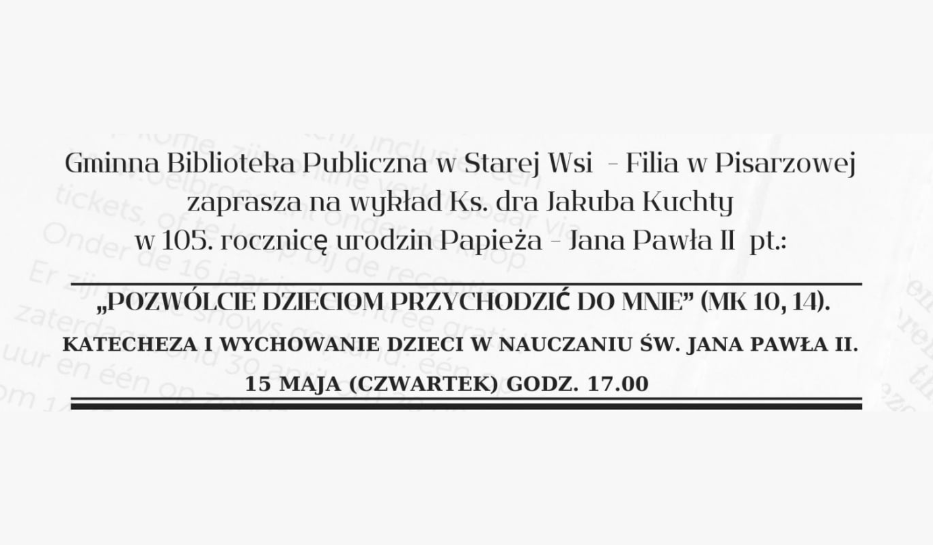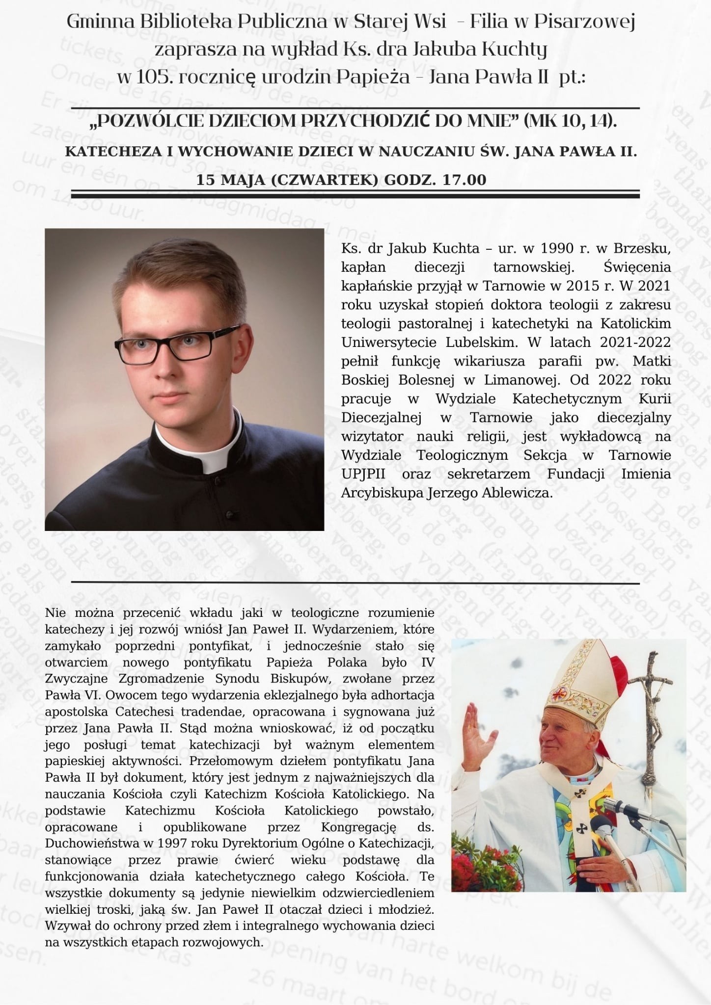 Gminna Biblioteka Publiczna w Starej Wsi - Filia w Pisarzowej zaprasza na wykład Ks. dra Jakuba Kuchty w 105 rocznicę urodzin Papieża - Jana Pawła II pt.: "POZWÓLCIE DZIECIOM PRZYCHODZIĆ DO MNIE." (MK 10,14). Katecheza i wychowanie dzieci w nauczaniu św. Jana Pawła II.