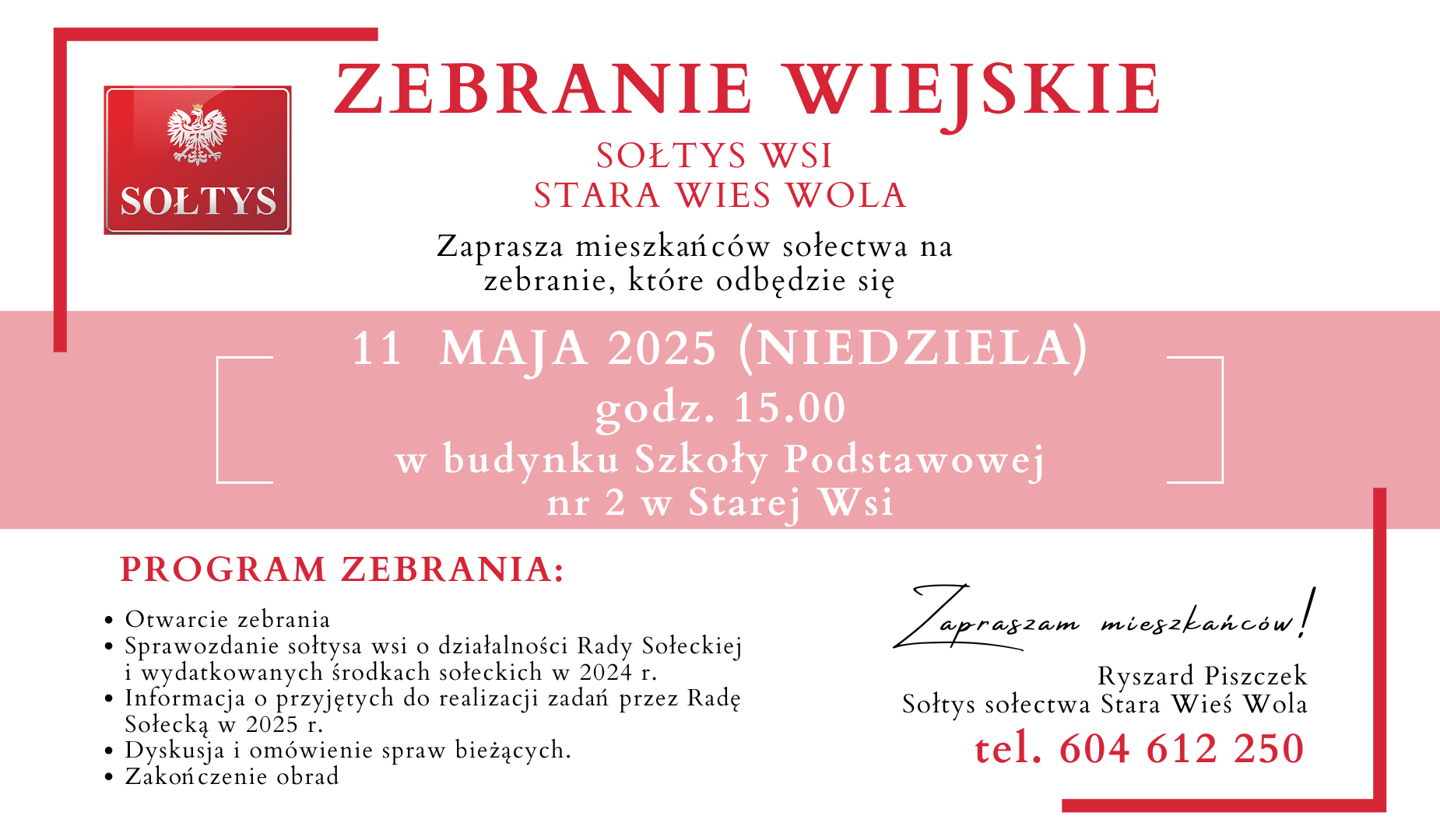 Sołtys wsi Stara Wieś Wola  zaprasza mieszkańców sołectwa na zebranie wiejskie, które odbędzie się w dniu 11 maja 2025 r. /niedzielao godz. 15.00 w budynku Szkoły Podstawowej nr 2 w Starej Wsi.