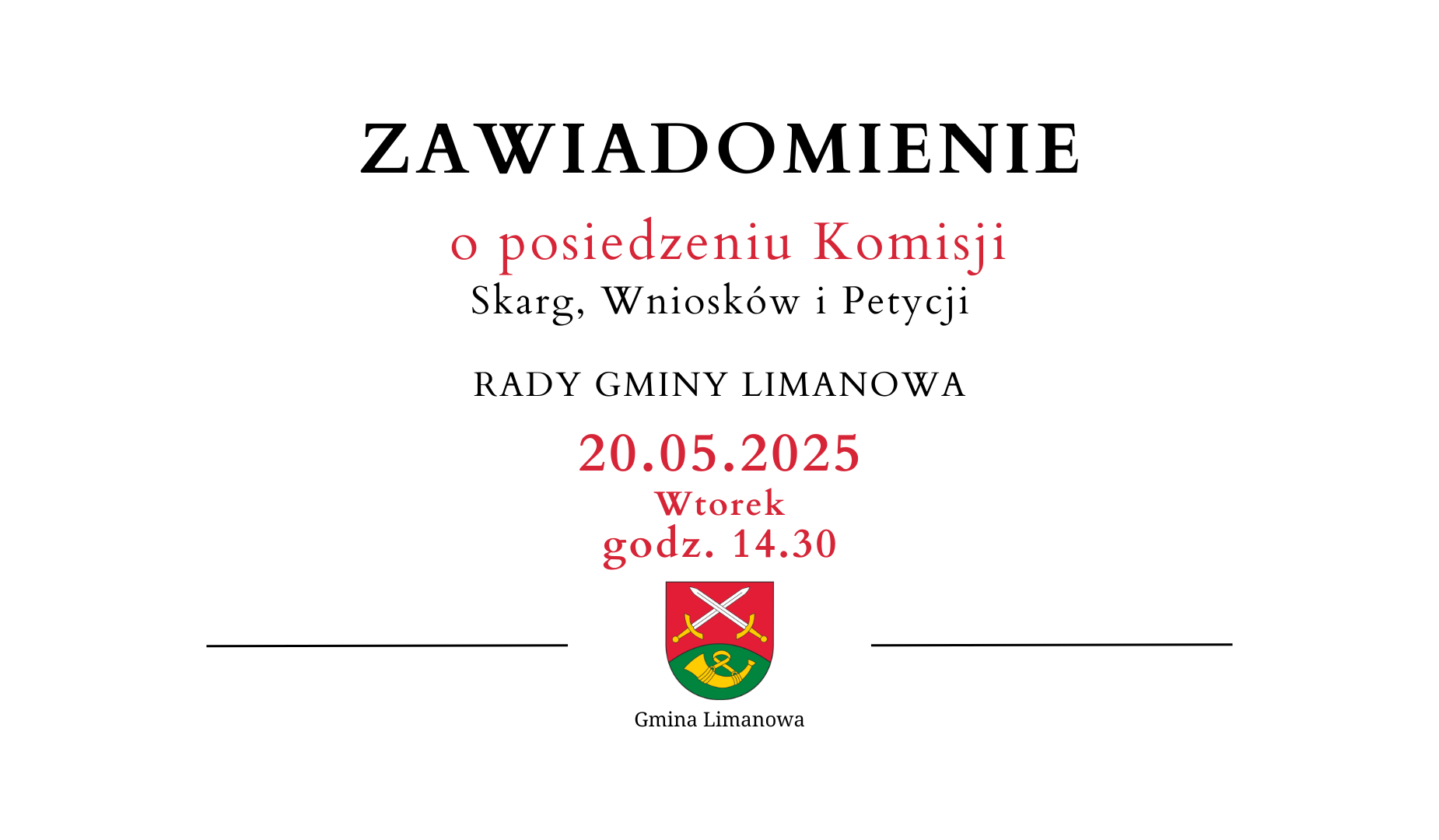 Na podstawie § 60 ust. 3 uchwały Nr XXIX/278/2018 Rady Gminy Limanowa z dnia 6 września 2018 r. w sprawie Statutu Gminy Limanowa (Dz. Urz. Woj. Mał. z 2018 r. poz. 6395) zapraszam na posiedzenie Komisji Skarg, Wniosków i Petycji Rady Gminy Limanowa, które odbędzie się w dniu 20 maja 2025 r. /wtorek/ o godz. 14.30 w sali konferencyjnej Urzędu Gminy Limanowa.