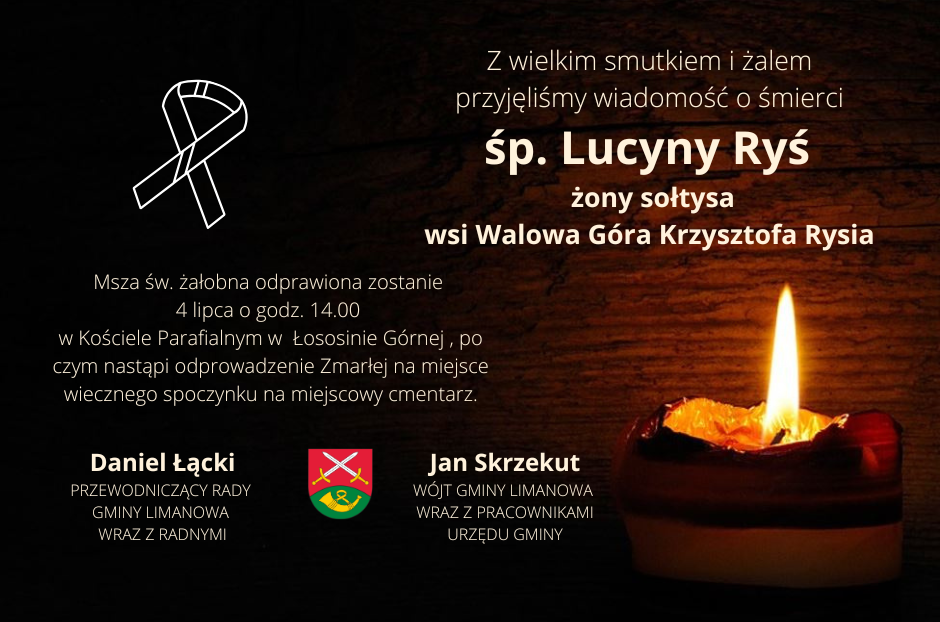 Z wielkim smutkiem i żalem przyjęliśmy wiadomość o śmierci śp. Lucyny Ryś żony sołtysa wsi Walowa Góra Krzysztofa Rysia. Msza św. żałobna odprawiona zostanie 4 lipca o godz. 14.00 w Kościele Parafialnym w Łososinie Górnej , po czym nastąpi odprowadzenie Zmarłej na miejsce wiecznego spoczynku na miejscowy cmentarz.
