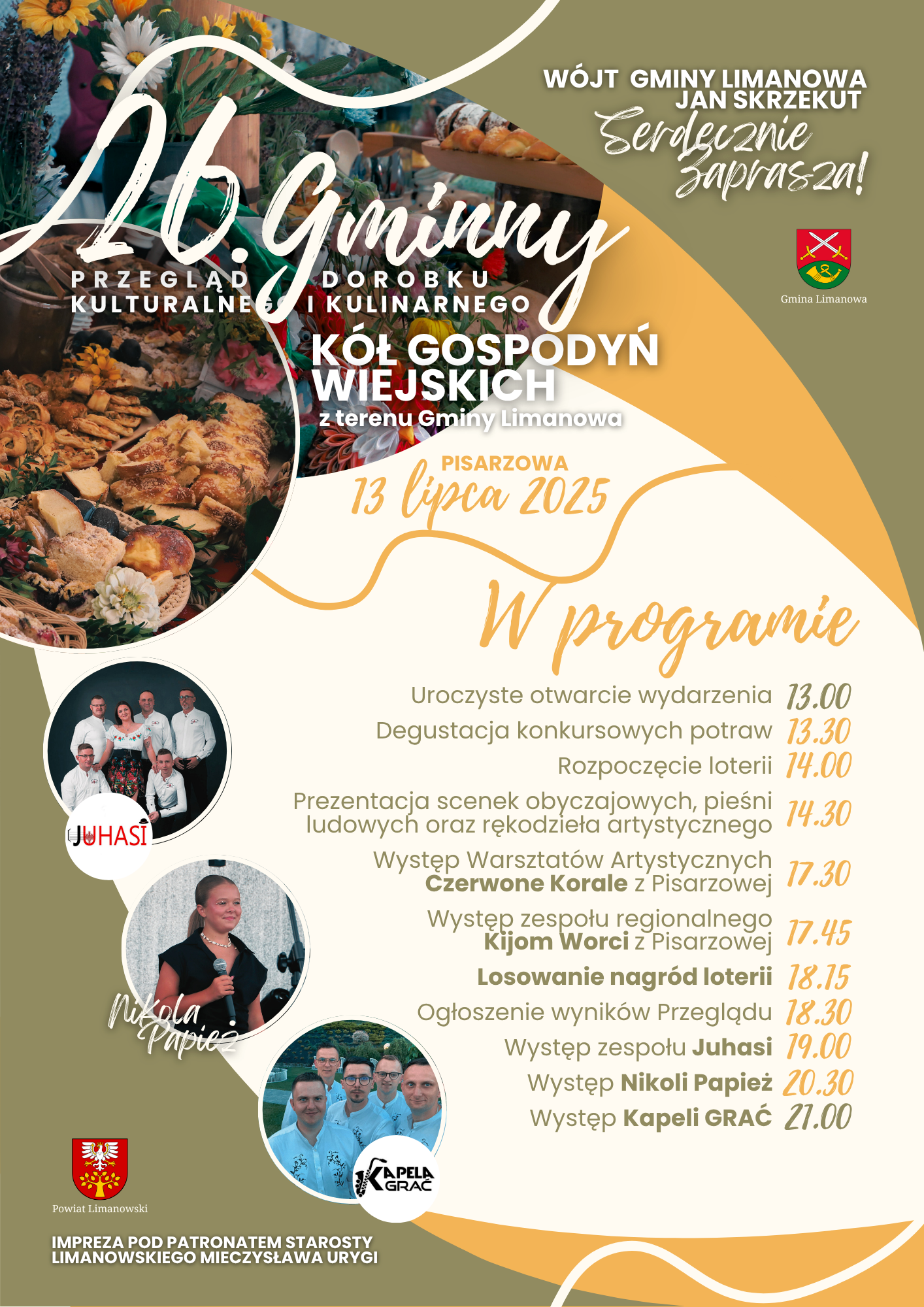 Podczas 26. Gminnego Przeglądu Dorobku Artystycznego i Kulinarnego Kół Gospodyń Wiejskich w Pisarzowej po części regionalnej na scenie wystąpią zespół JUHASI, NIKOLA PAPIEŻ oraz KAPELA GRAĆ.