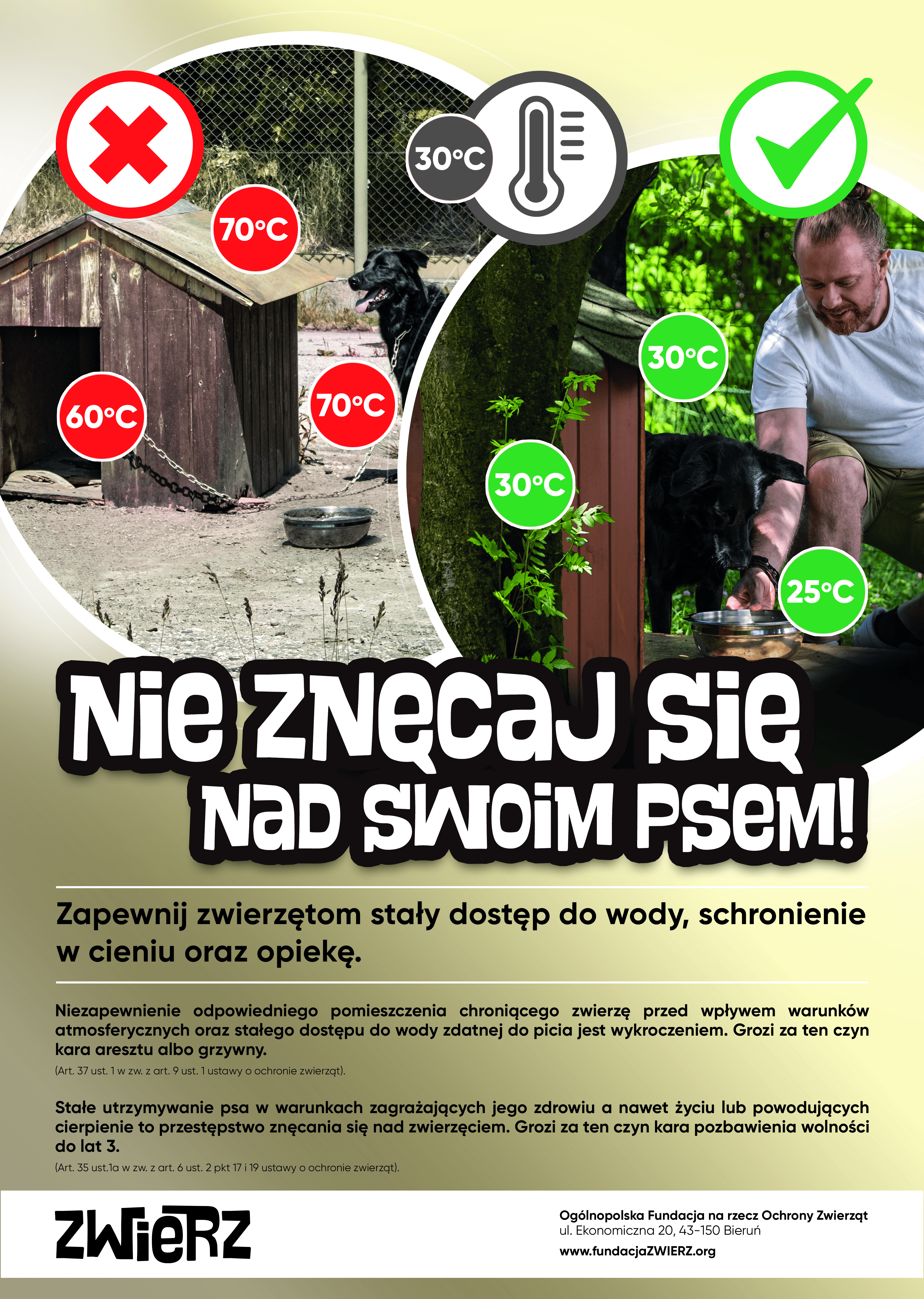 Odwodnienie, poparzenia, udar to tylko niektóre z zagrożeń, które wynikają z niewłaściwej opieki nad zwierzęciem latem. Szczególnie w trudnych warunkach są zwierzęta żyjące na uwięzi, pozostawione same sobie, często bez kropli wody zdatnej do picia. Buda, która stoi na otwartym słońcu i jest pokryta blachą nagrzewa się i temperatura w środku sięga nawet 70*C. Metalowy łańcuch rozgrzewa się do podobnych temperatur i może powodować poparzenia na skórze zwierzęcia.