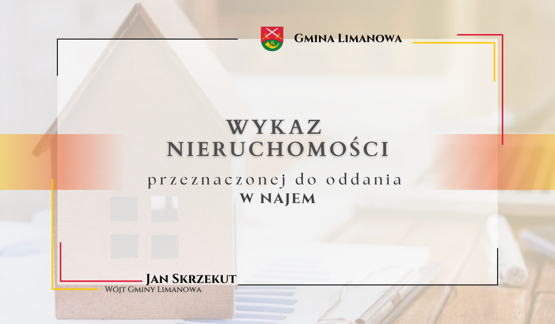 Na podstawie art. 35 ust. 1 i ust. 2 ustawy z dnia 21 sierpnia 1997 r. o gospodarce nieruchomościami (Dz. U. z 2024 r. poz. 1145 ze zm.) Wójt Gminy Limanowa podaje do publicznej wiadomości wykaz nieruchomości przeznaczonej do oddania w najem: