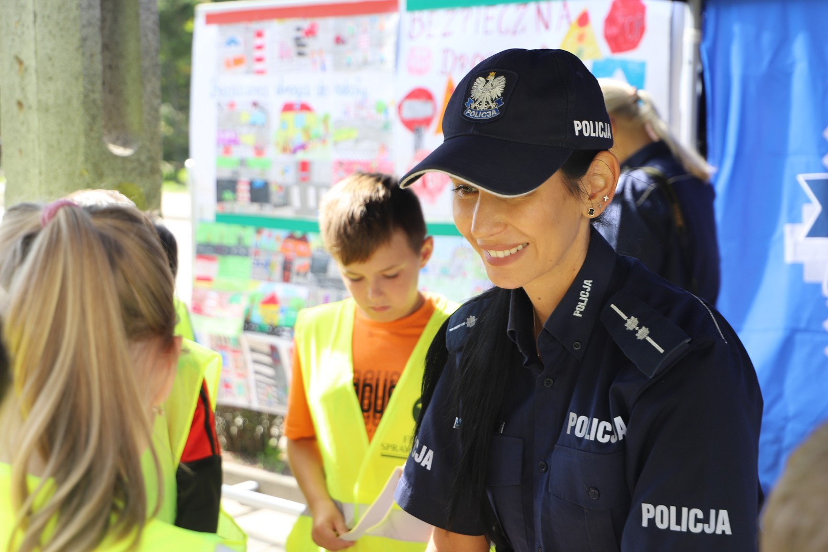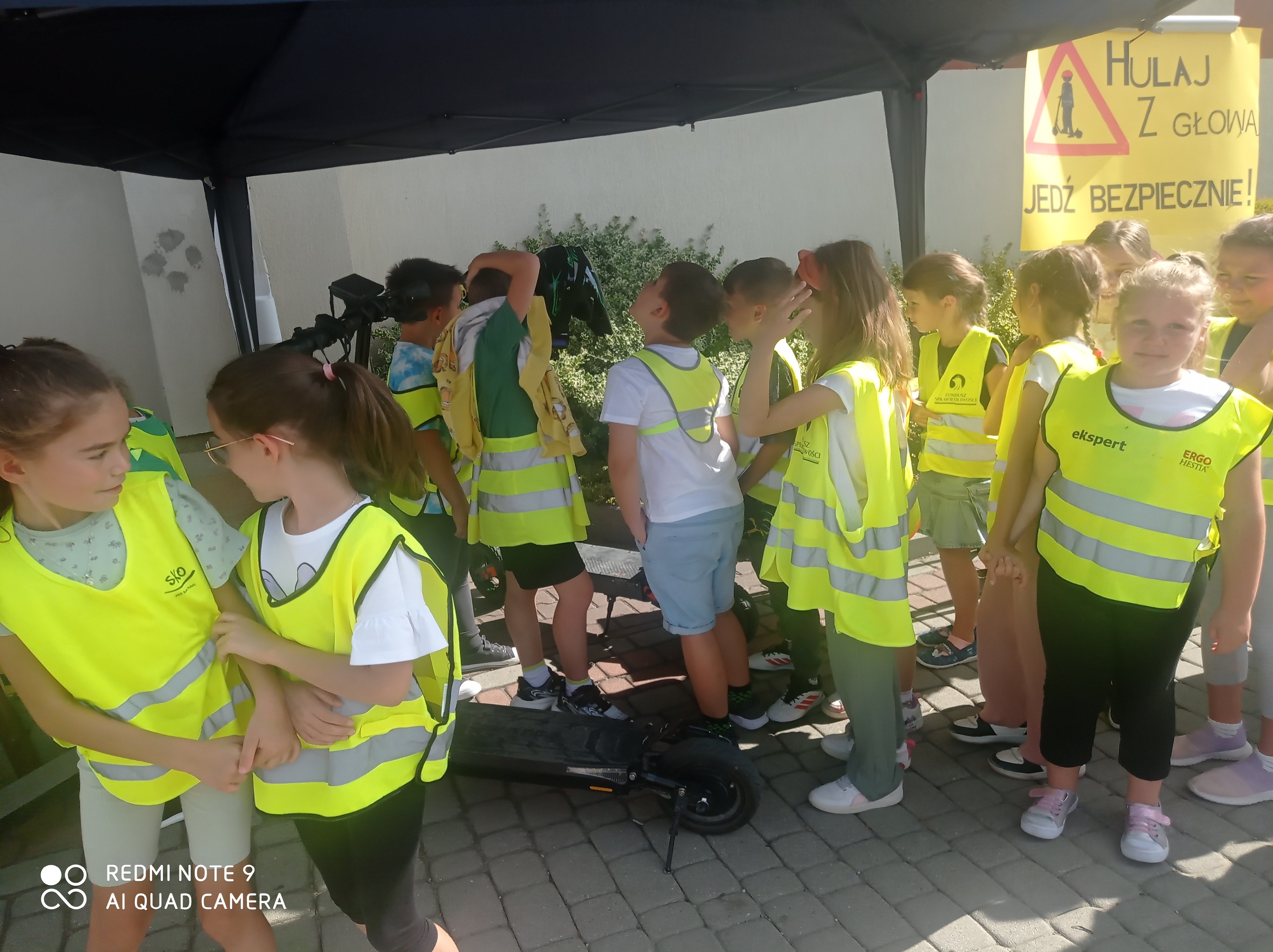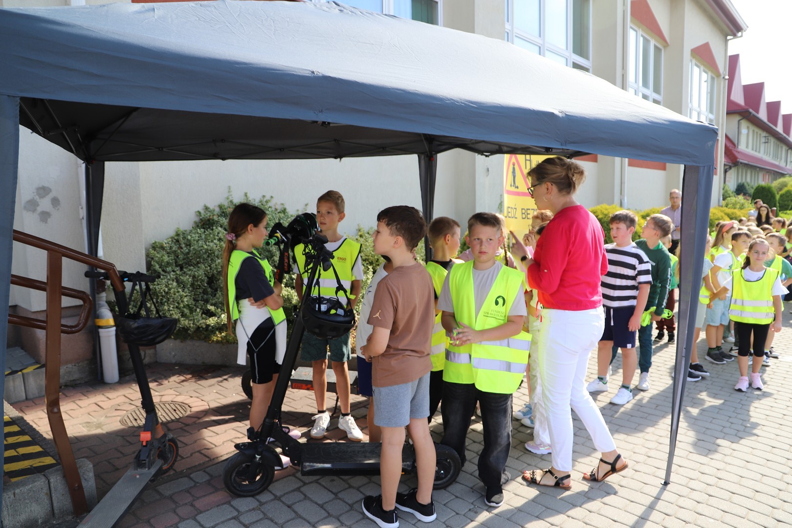 pogadanka o bezpieczeństwie w ruchu drogowym ze szczególnym zwróceniem uwagi na bezpieczne korzystanie z hulajnogi elektrycznej. Nie zabrakło też części praktycznej – najmłodsi uczyli się prawidłowego przechodzenia przez jezdnię pod okiem funkcjonariuszy. Odbyły się także