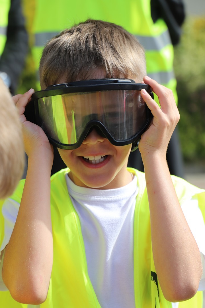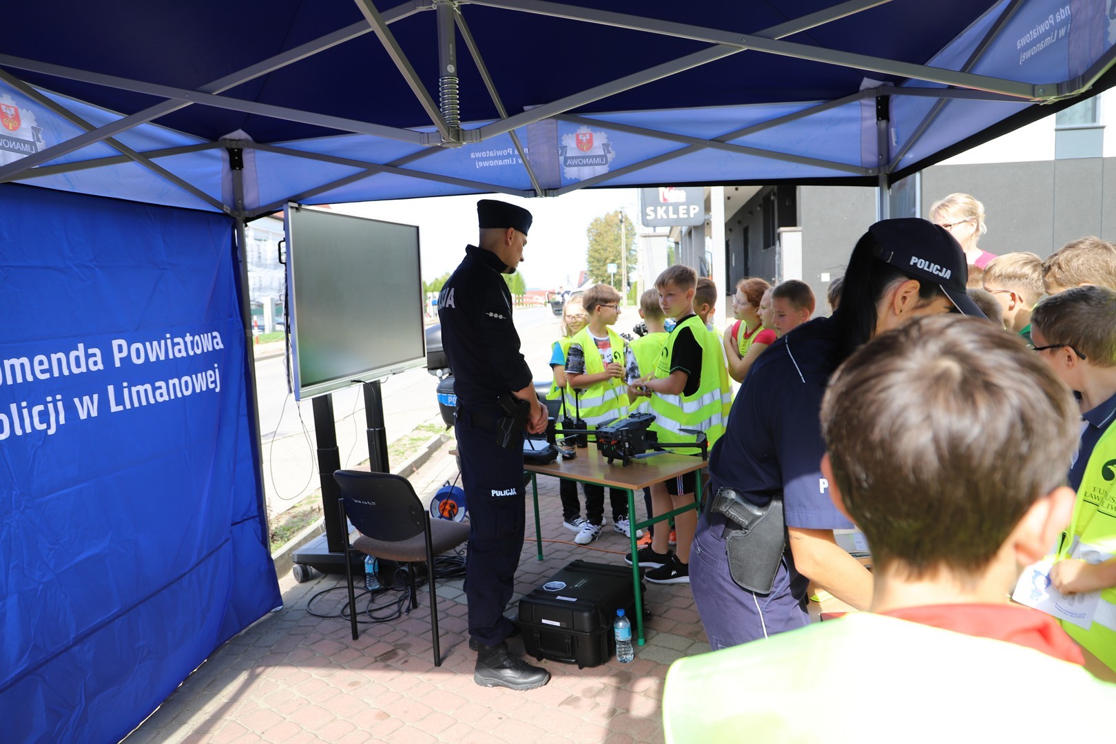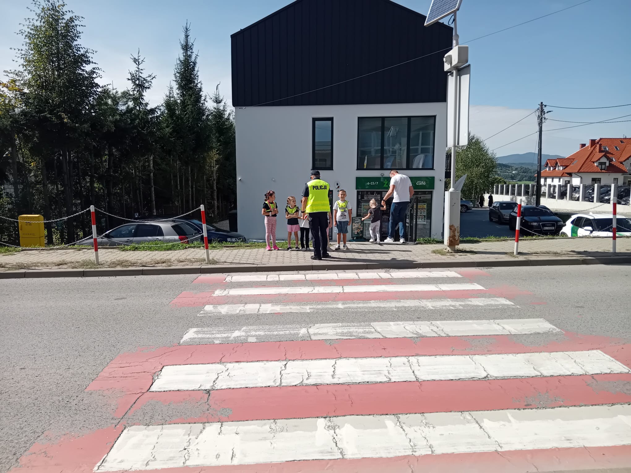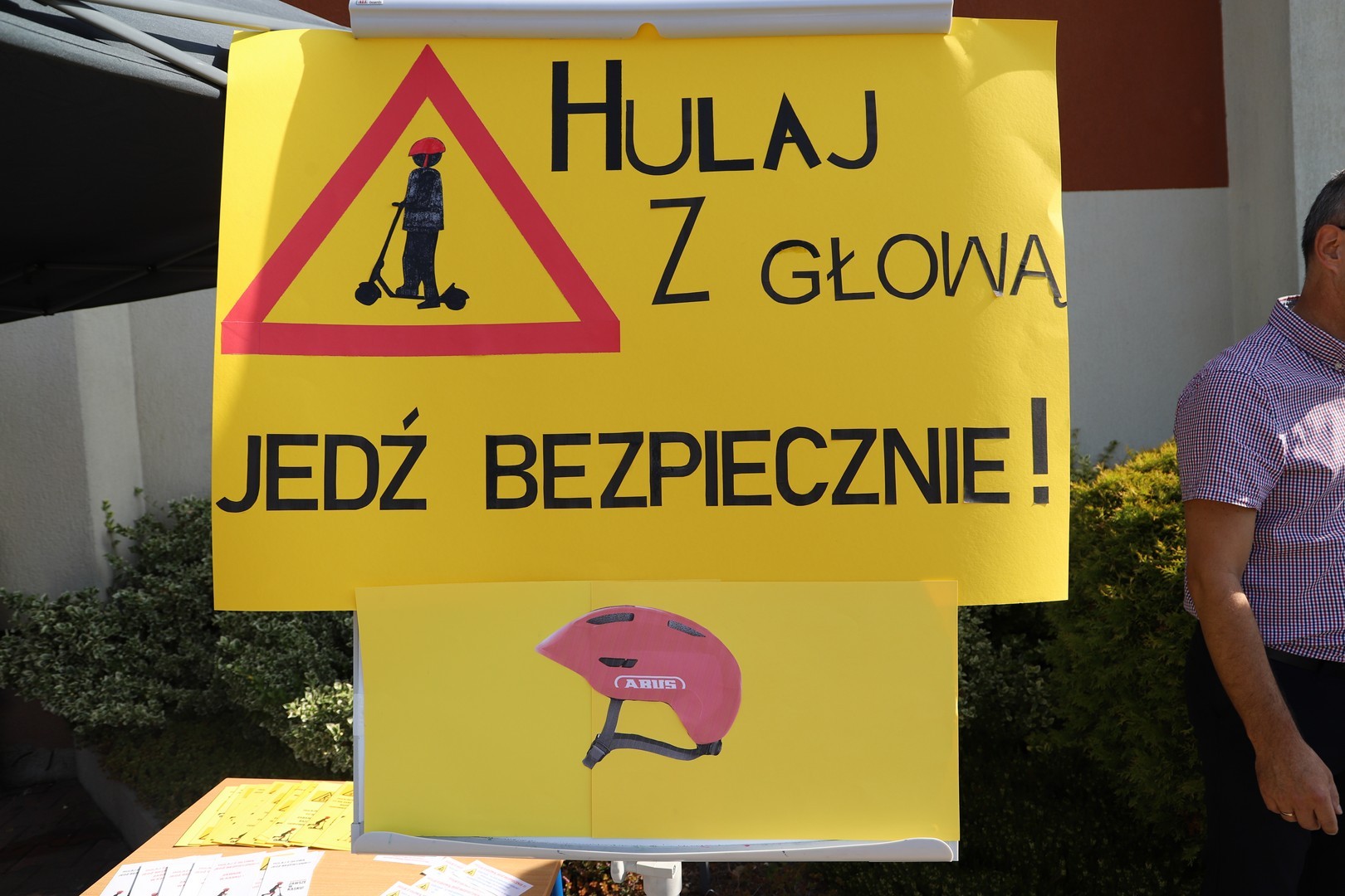 pogadanka o bezpieczeństwie w ruchu drogowym ze szczególnym zwróceniem uwagi na bezpieczne korzystanie z hulajnogi elektrycznej. Nie zabrakło też części praktycznej – najmłodsi uczyli się prawidłowego przechodzenia przez jezdnię pod okiem funkcjonariuszy. Odbyły się także
