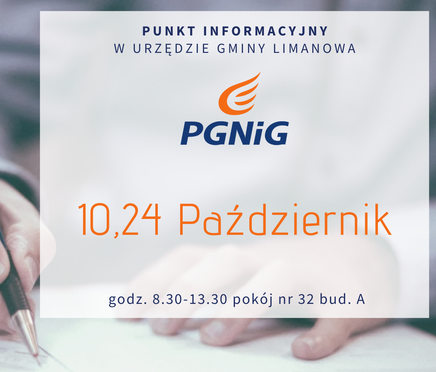 Kolejne terminy dyżuru doradcy PGNiG w Urzędzie Gminy Limanowa w miesiącu PAŹDZIERNIKU, najbliższy - 10 października, a na kolejny musimy poczekac do 24 października.