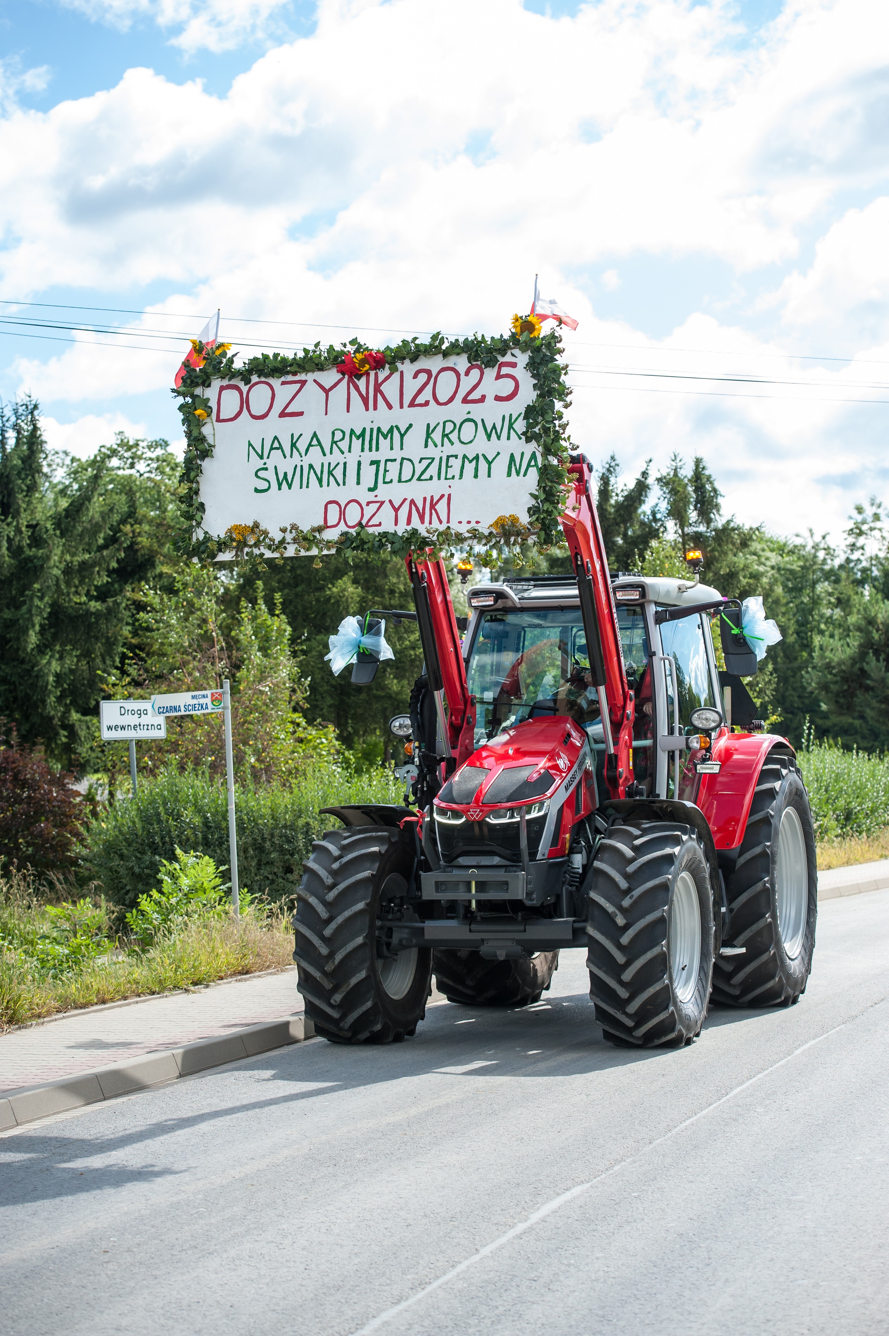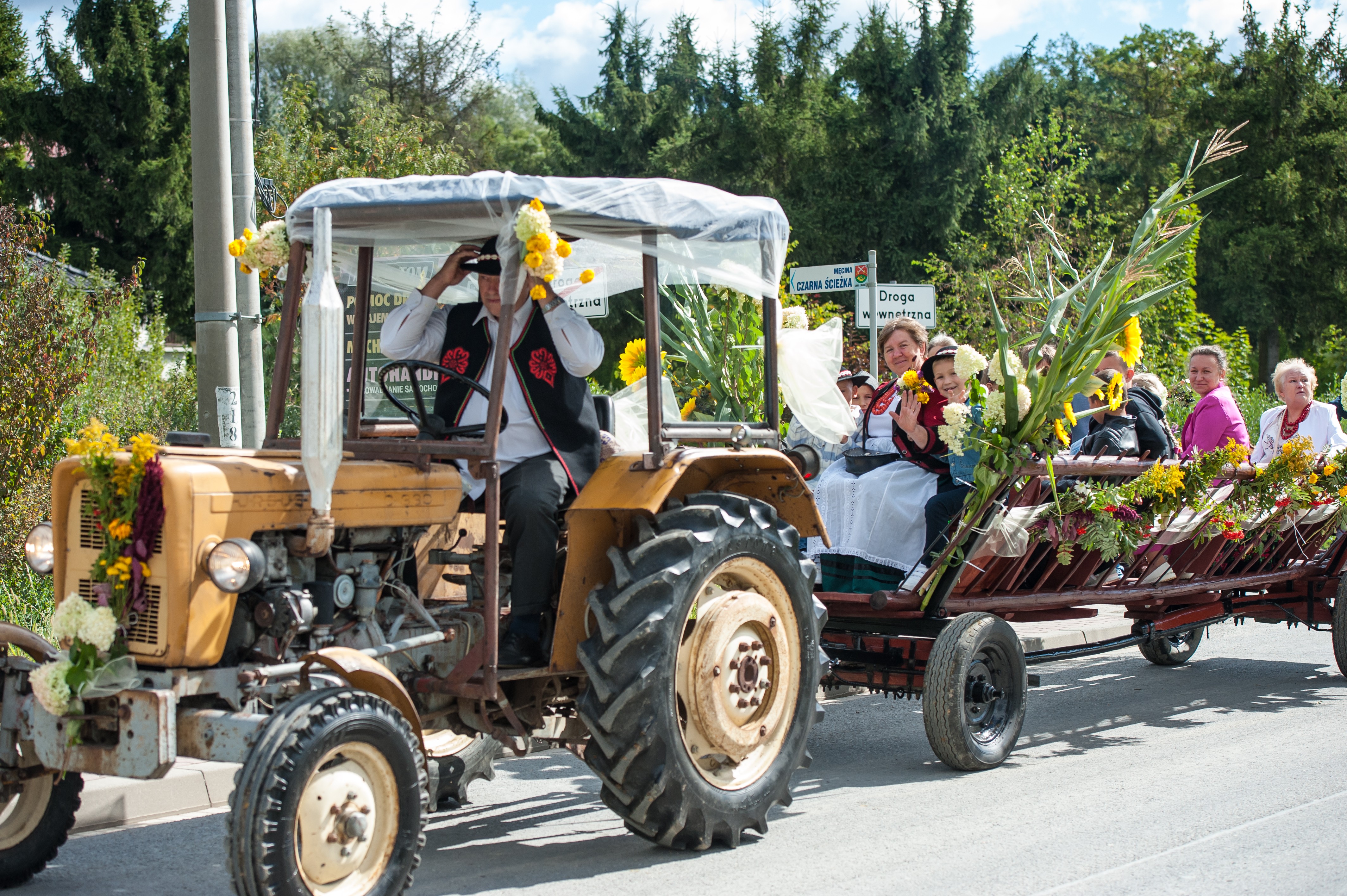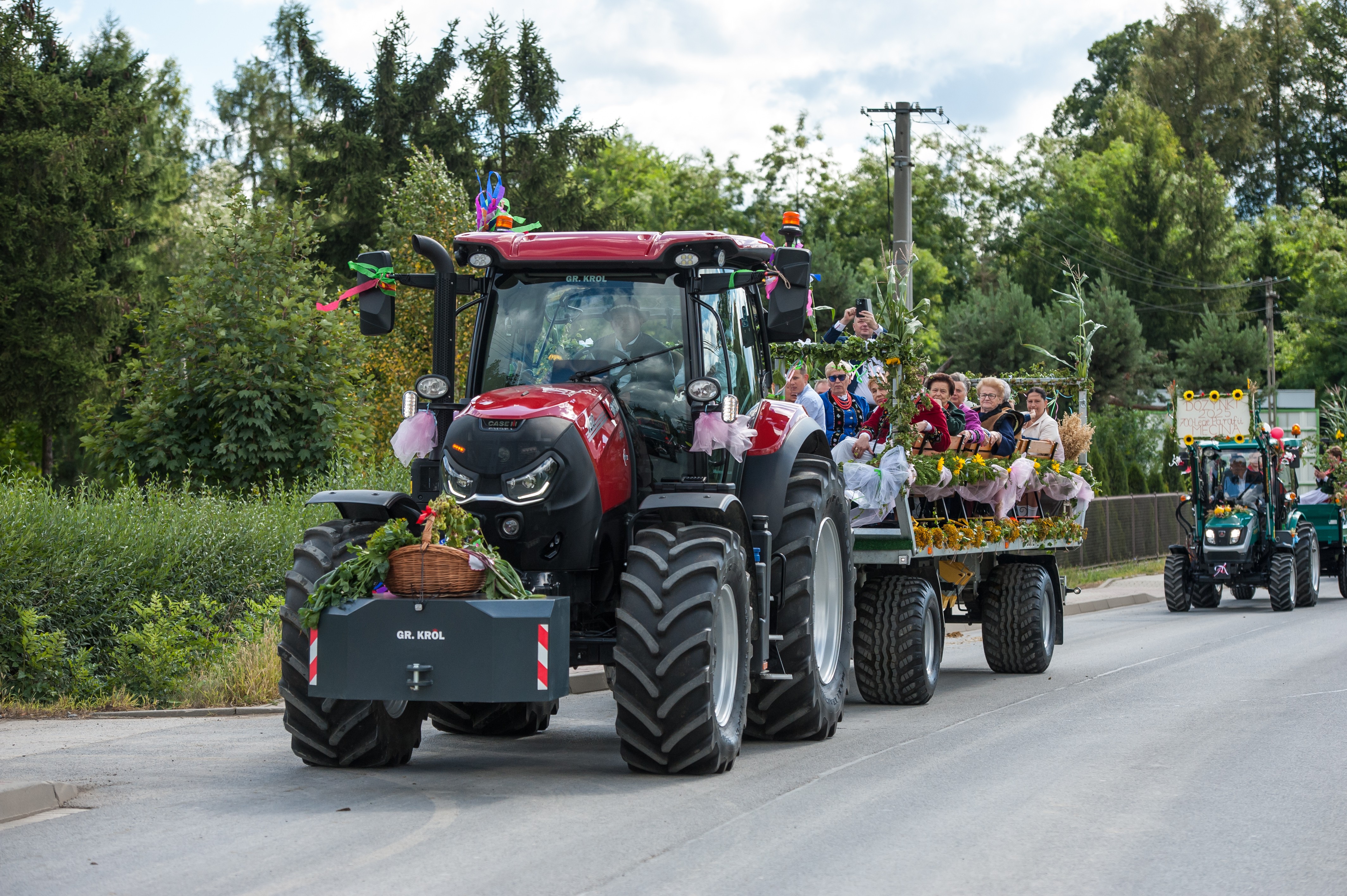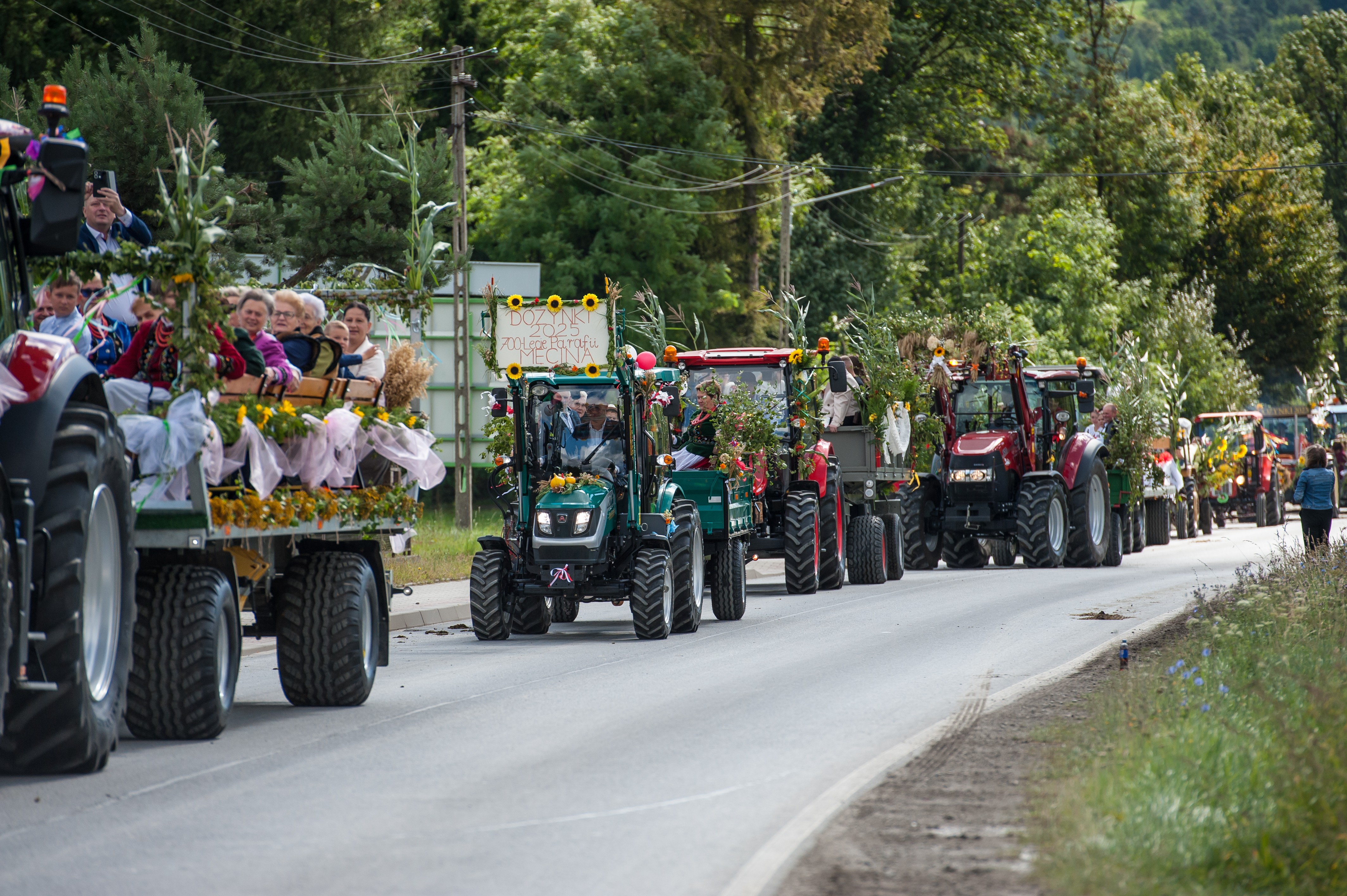 Po Mszy św. miał miejsce uroczysty przejazd korowodem dożynkowym drogami Męciny, w którym udział wzięli goście i wszystkie chętne osoby. Przejazd ulicami miejscowości przyciąga mieszkańców i turystów, tworząc niepowtarzalną atmosferę święta i wspólnoty, co widać było szczególnie w tym dniu. Po powrocie odbył się wspólny obiad i ksiądz proboszcz powitał wszystkich zebranych na placu przy kościele. Po powitaniu rozpoczęły się występy, które zapoczątkował zespół Męcinianie. Pięknie przygotowana choreografia, taniec i śpiew rozbrzmiały przy męcińskiej świątyni, a młodzież i dzieci zachwyciły wszystkich swoim występem. Tuż po nim zespół Tradycja, czyli seniorki z Męciny zaprezentowały się ze swoim programem.